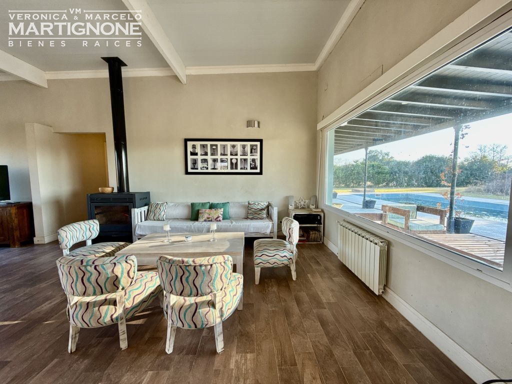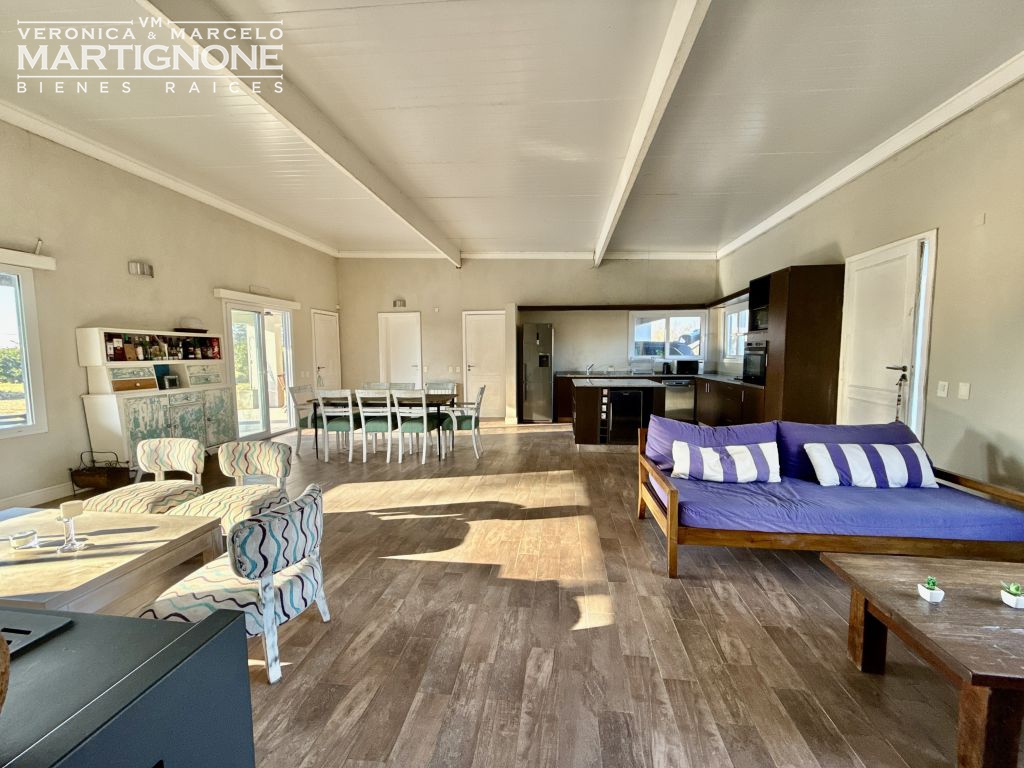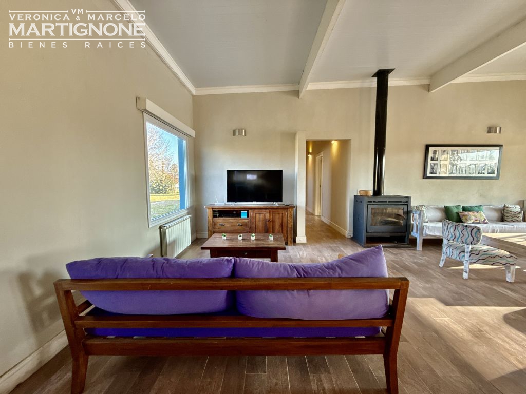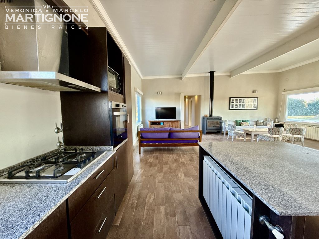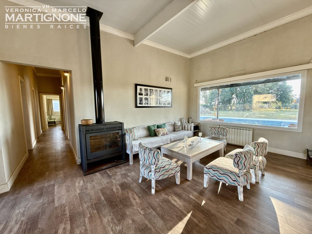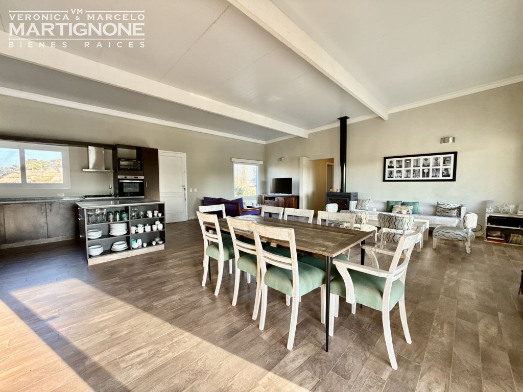 Living con salamandra Tromen y comedor integrado a la cocina, con vistas al jardin y mucha luz.