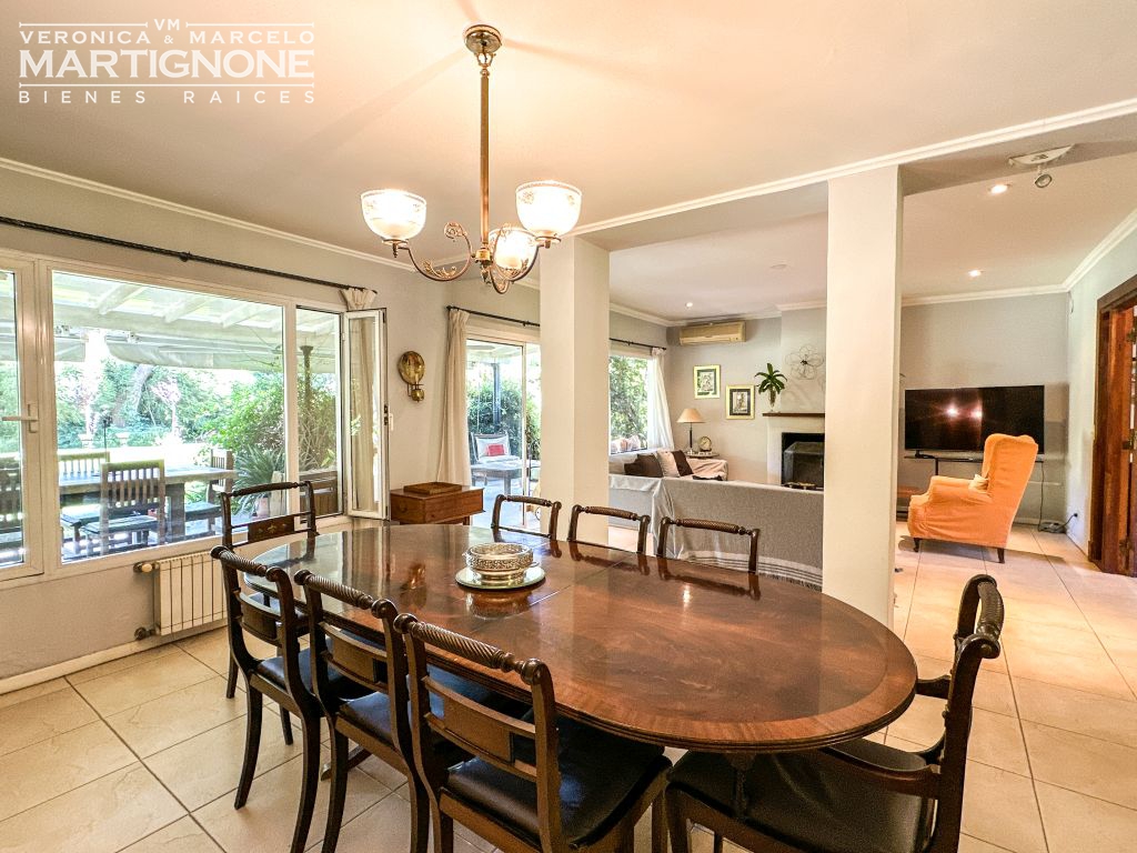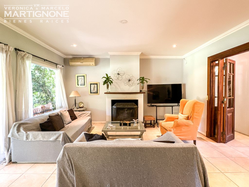 Living con hogar a leña y comedor.