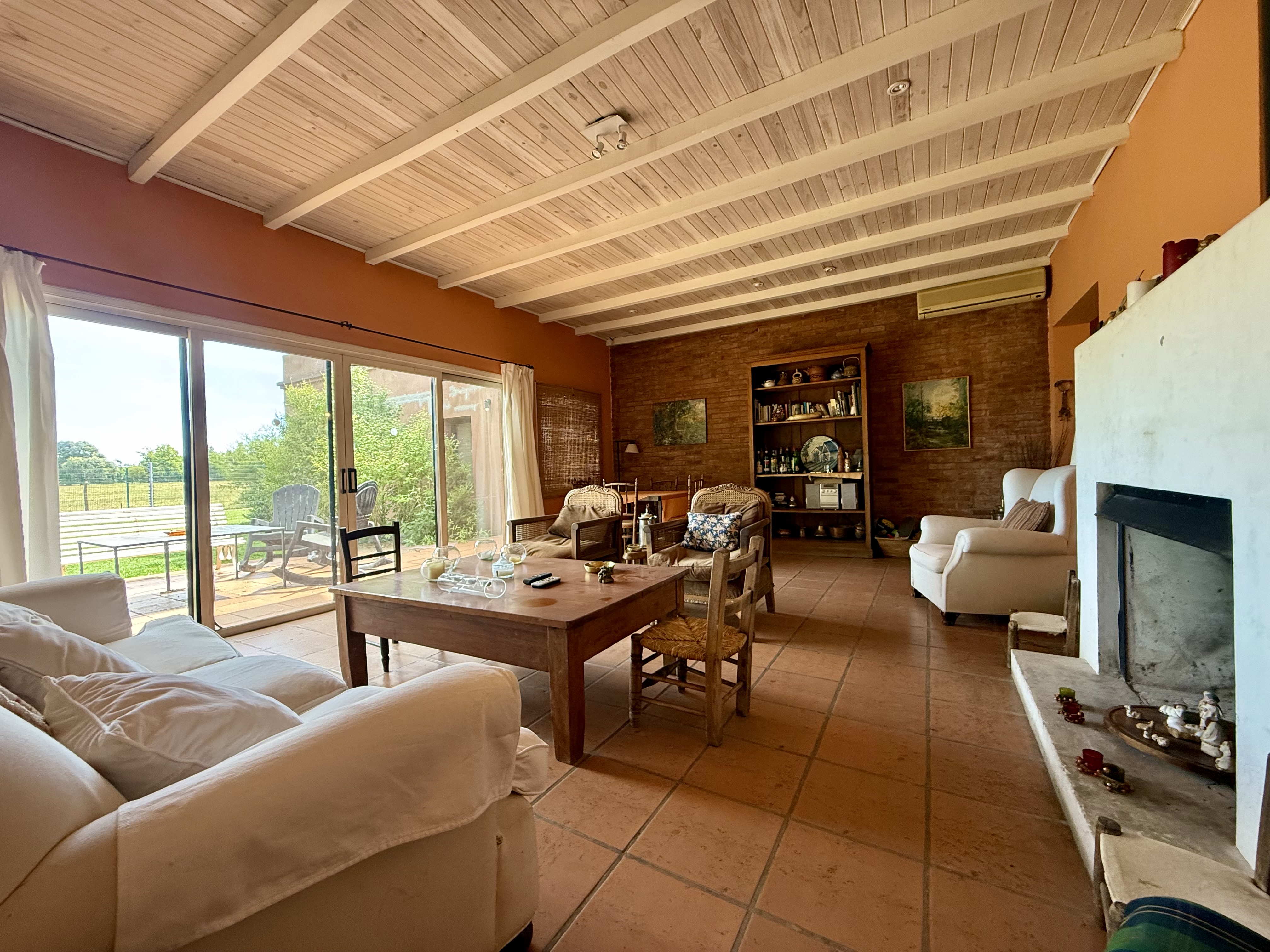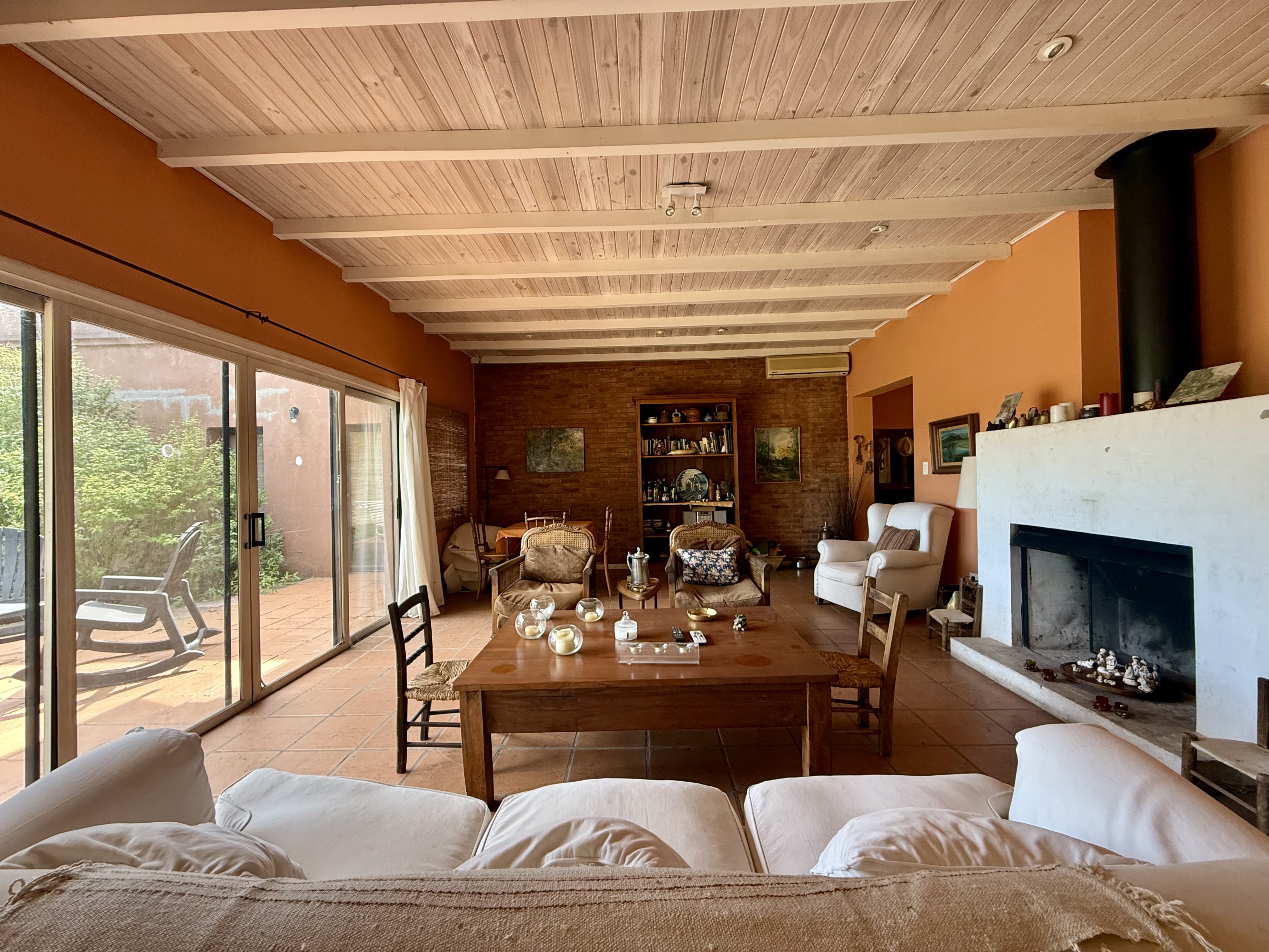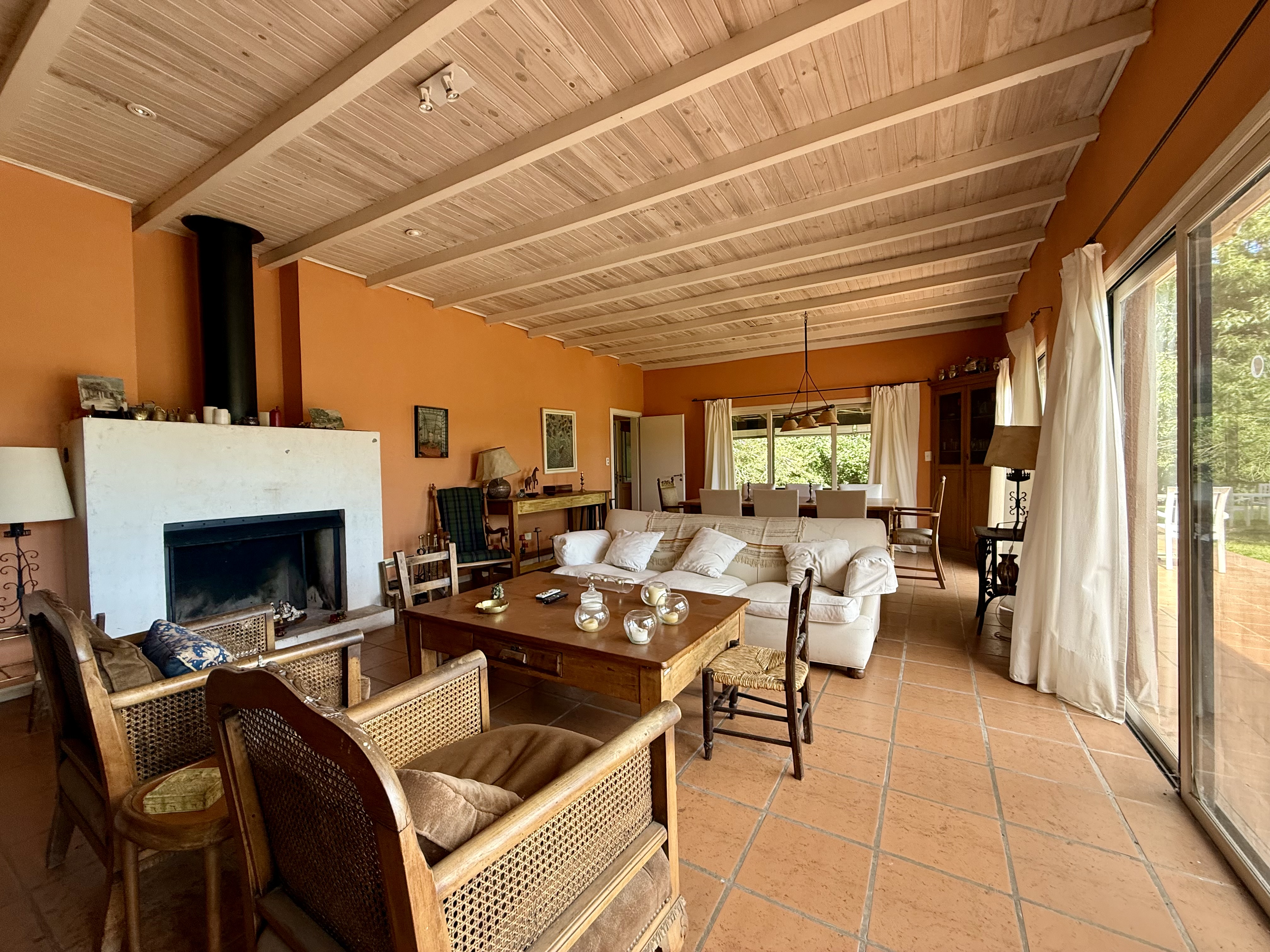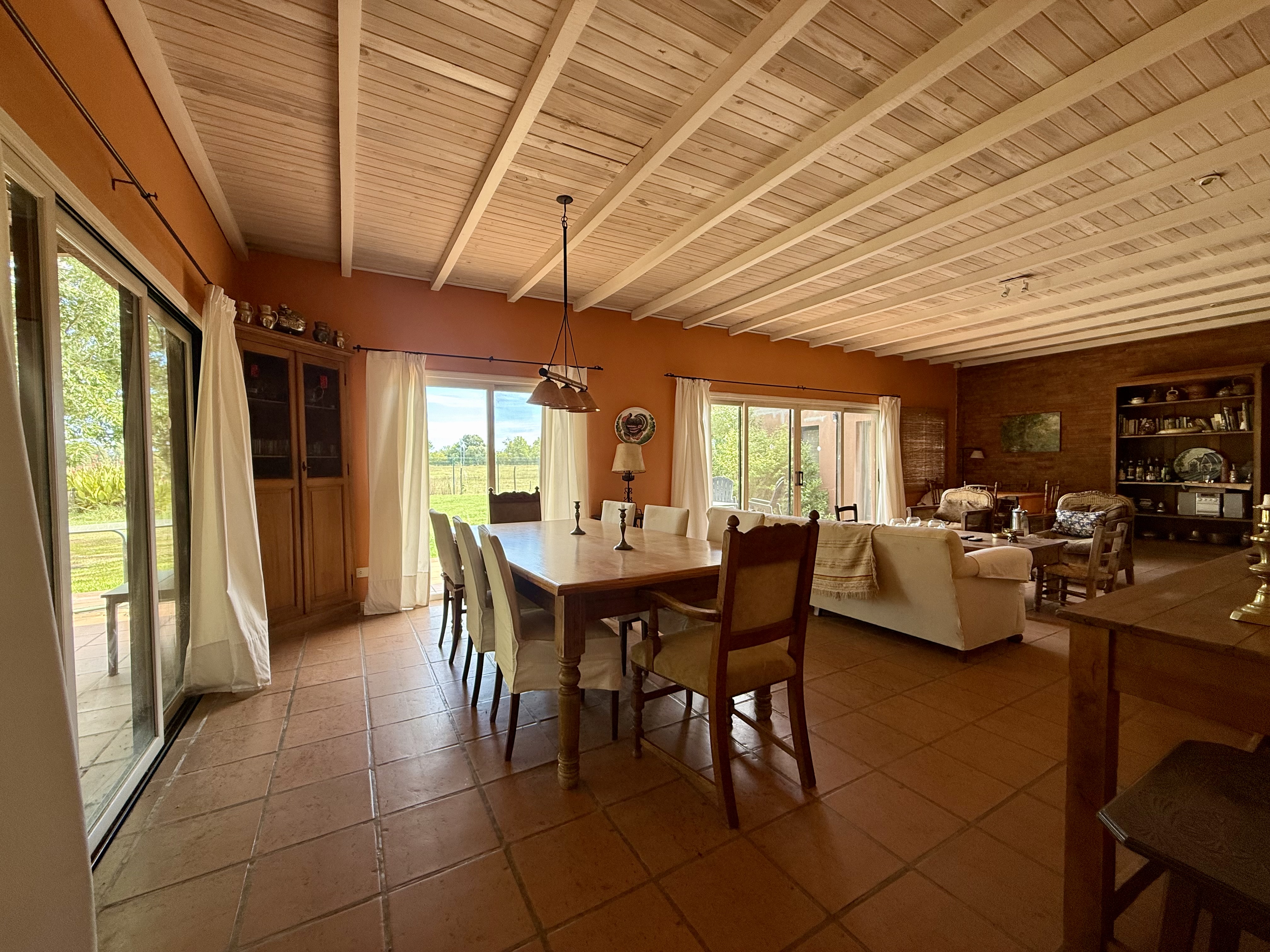 Living con hogar a leña y comedor, con vista al jardín y al campo lindero donde caballos