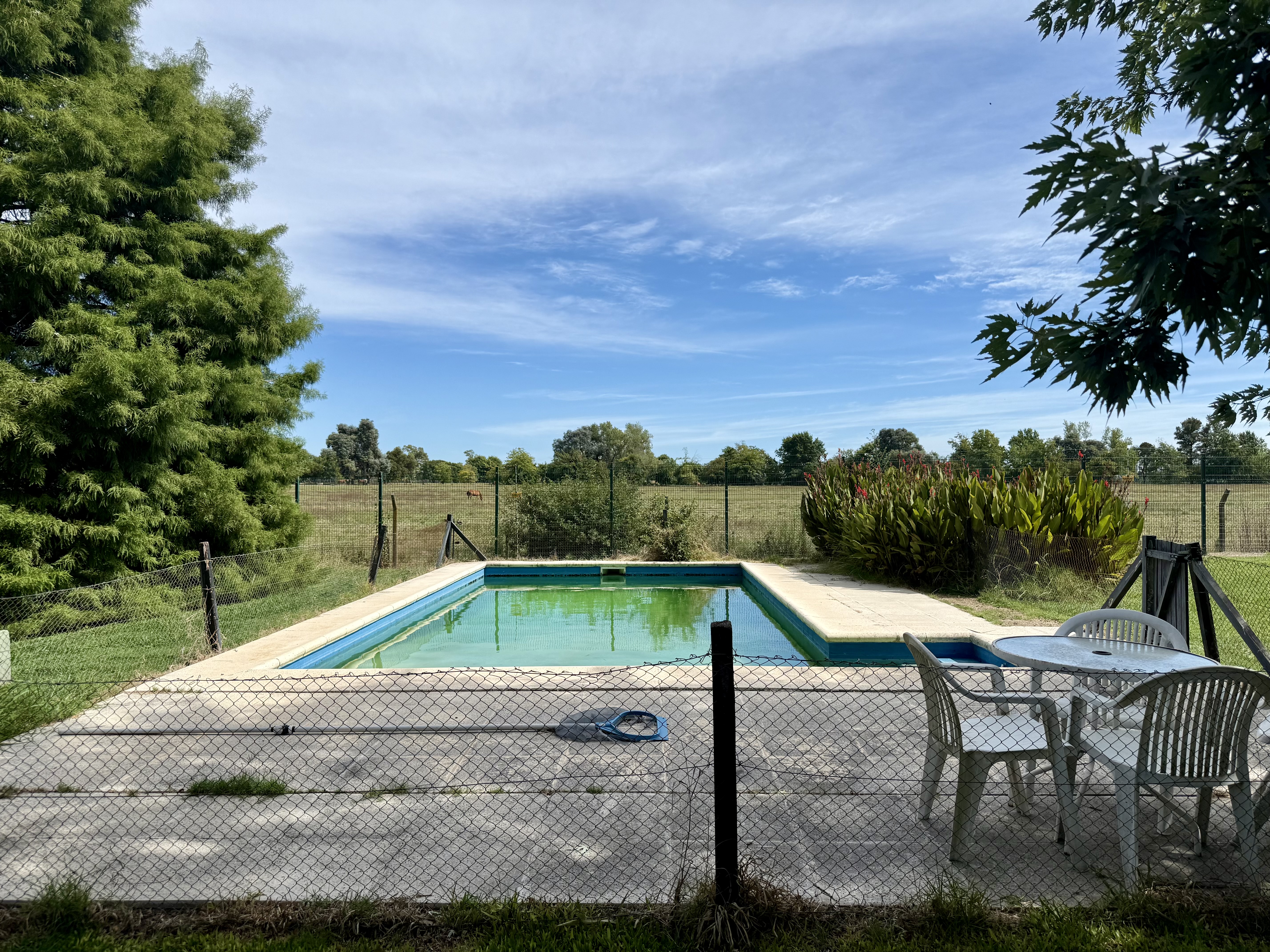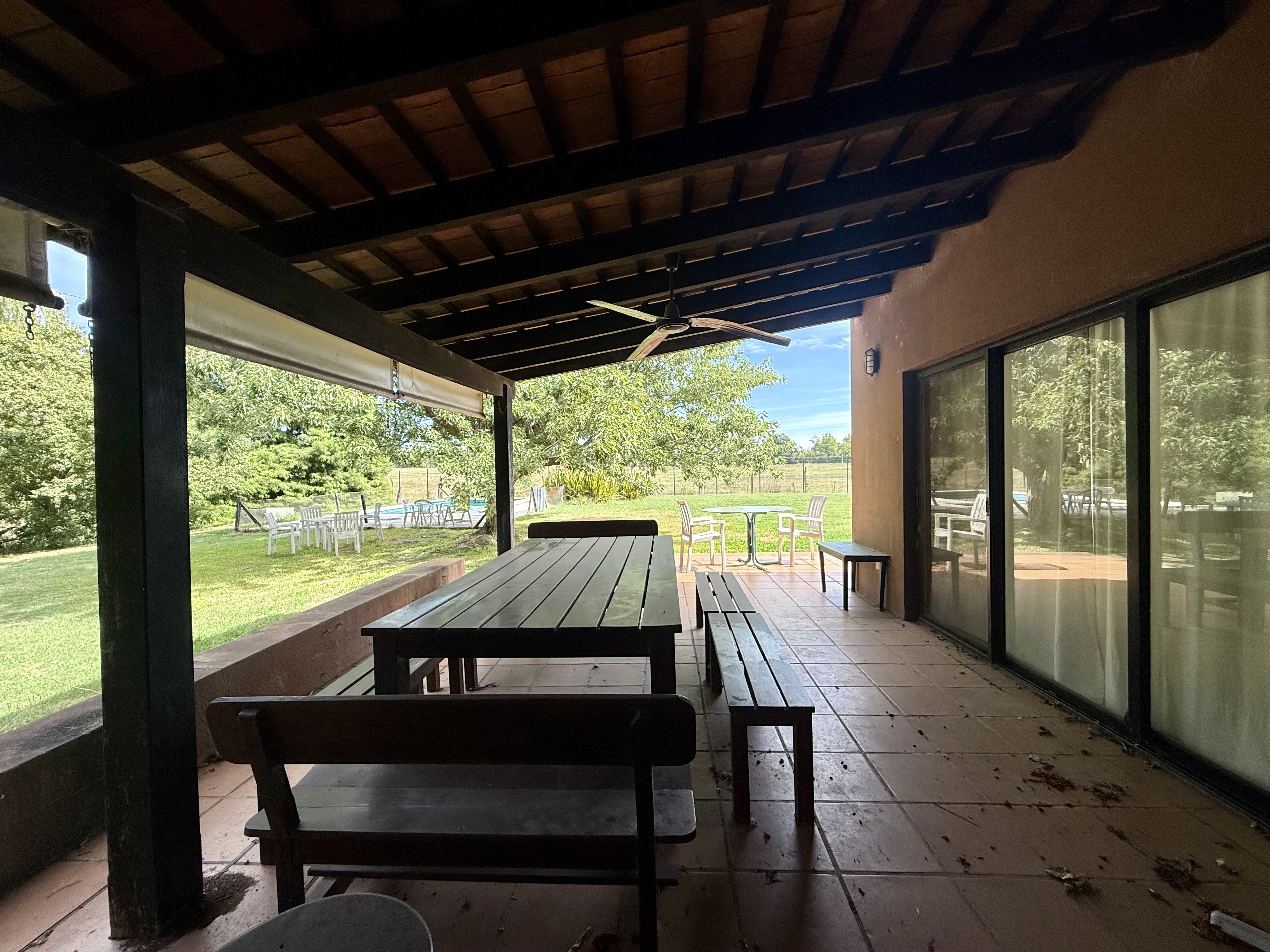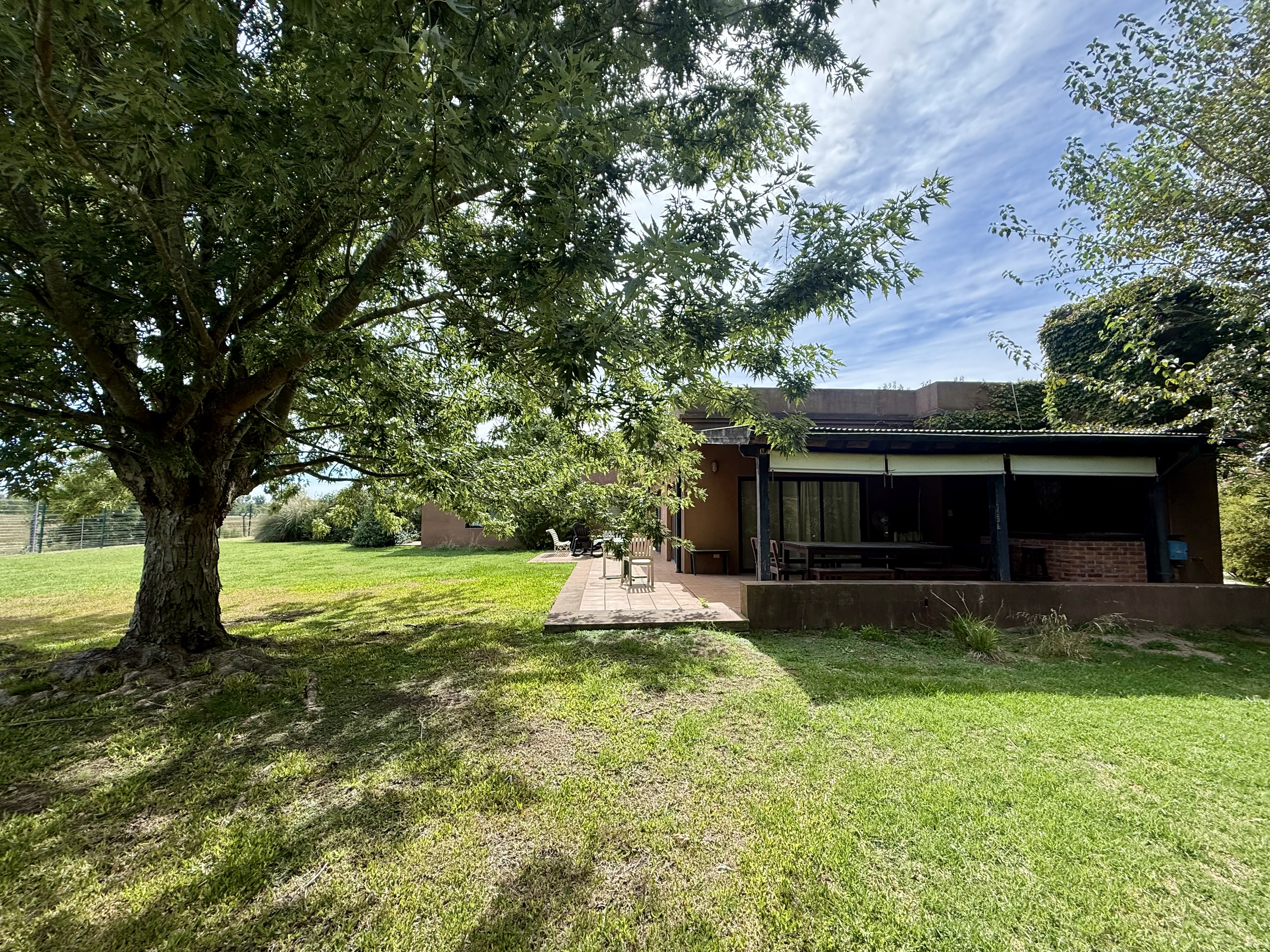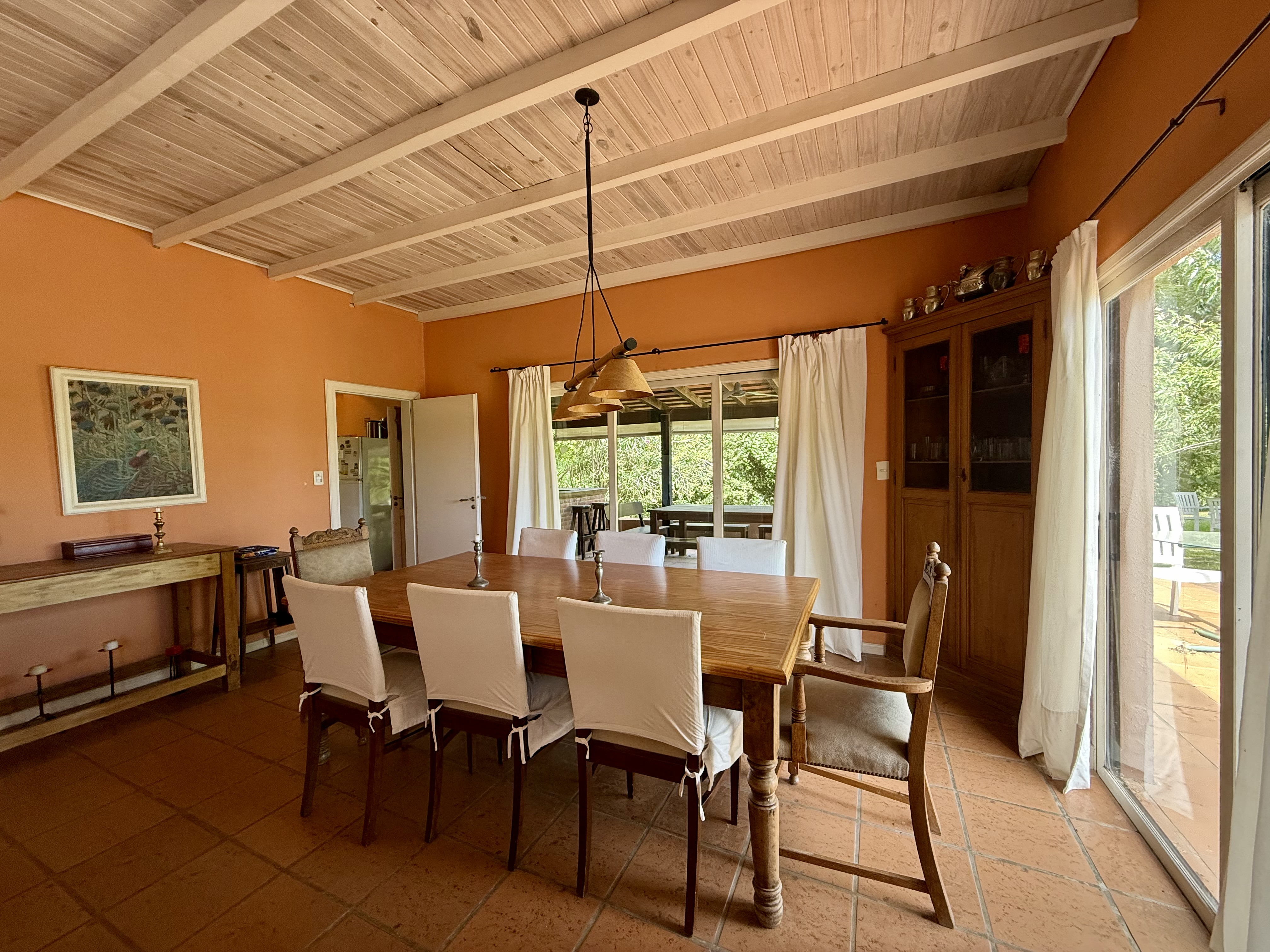 Living con hogar a leña y comedor, con vista al jardín y al campo lindero donde caballos