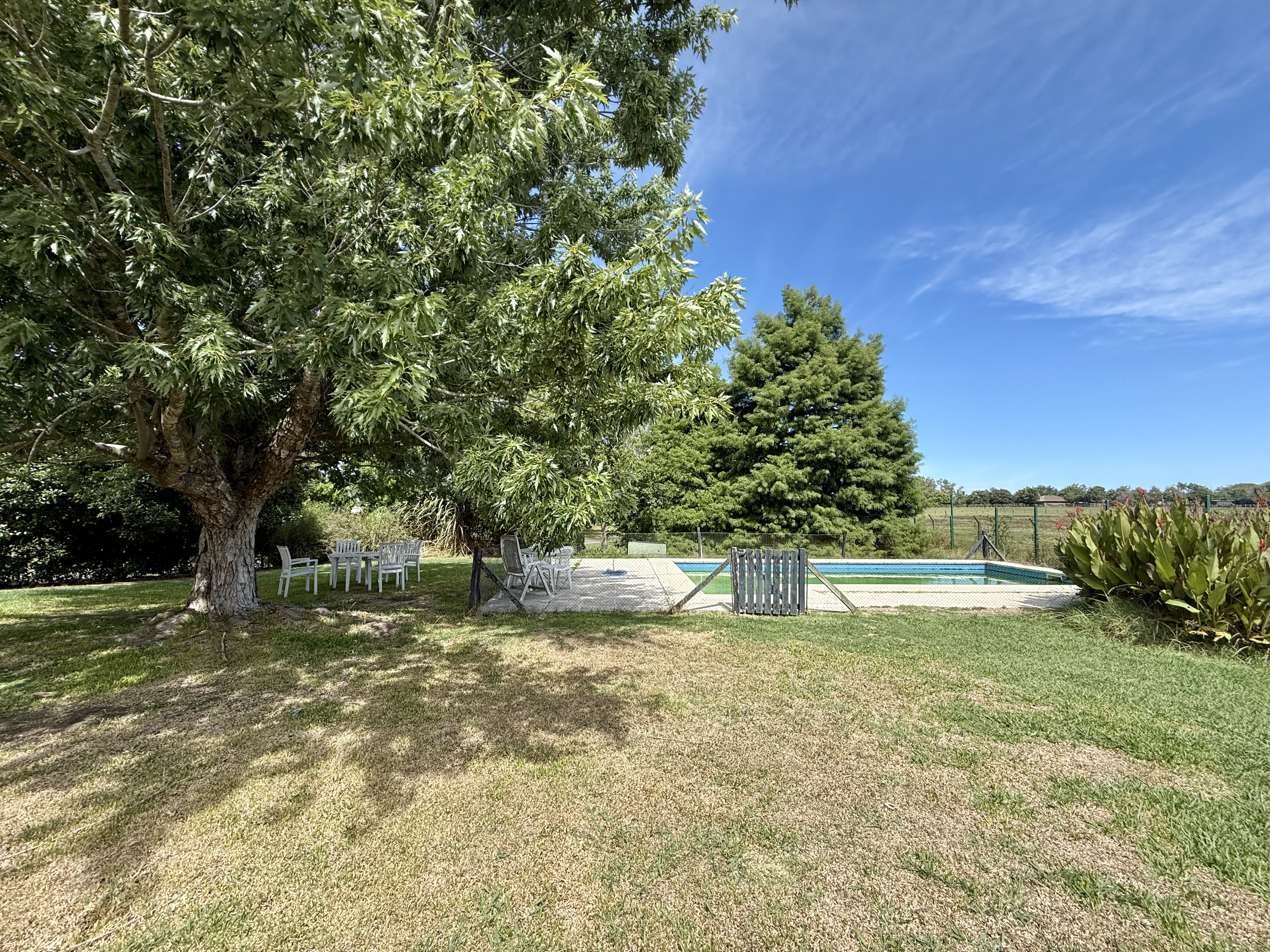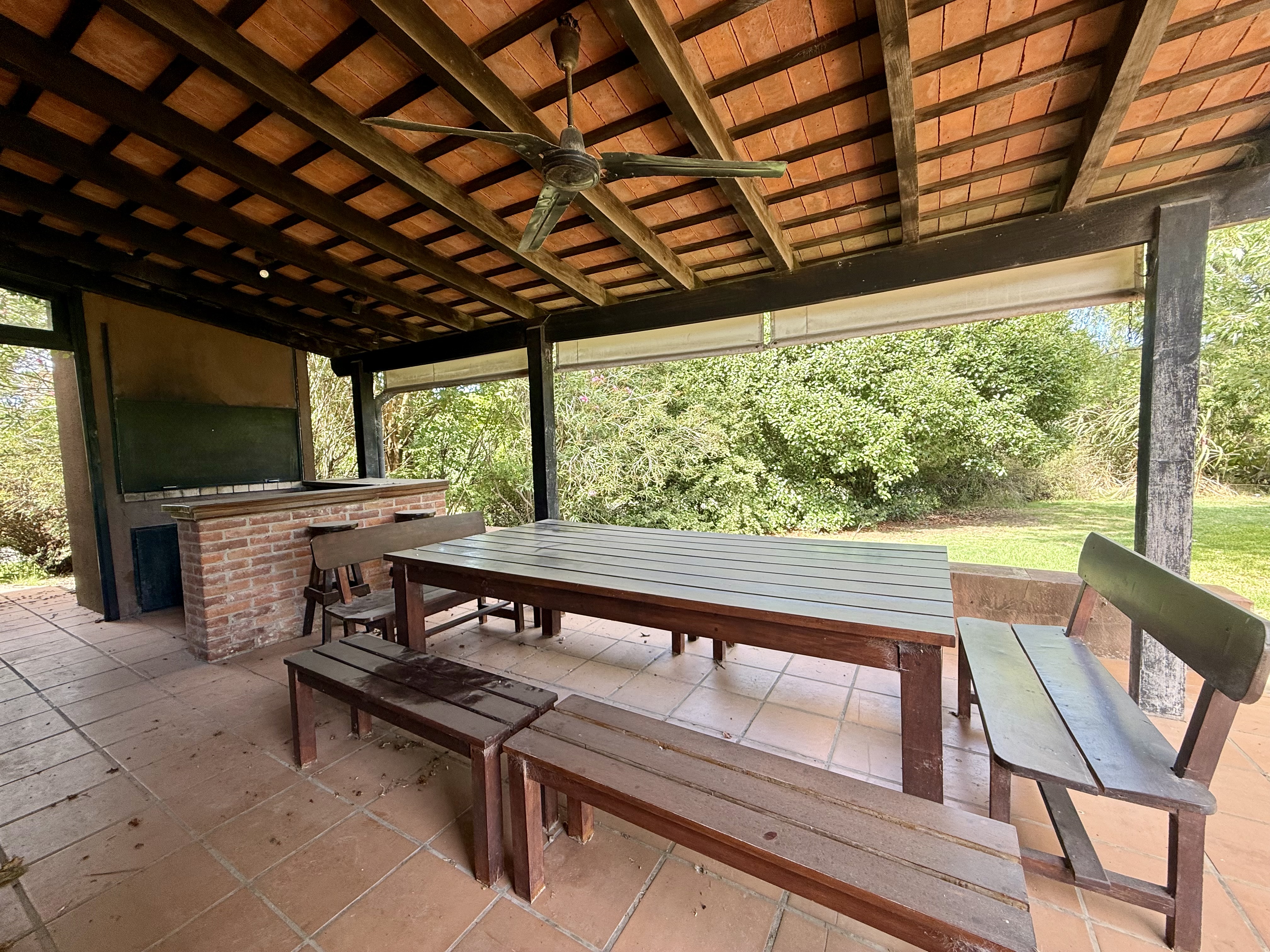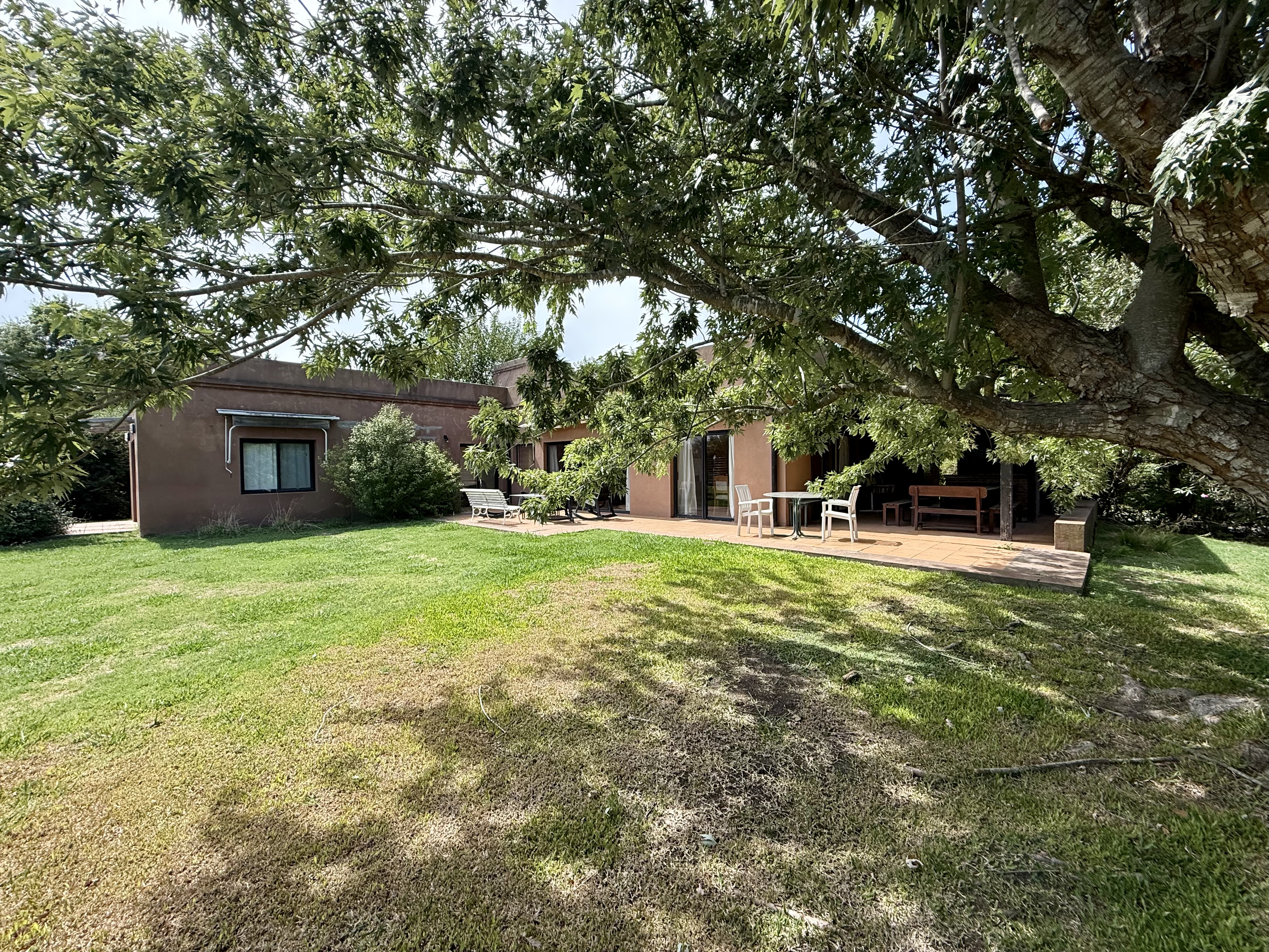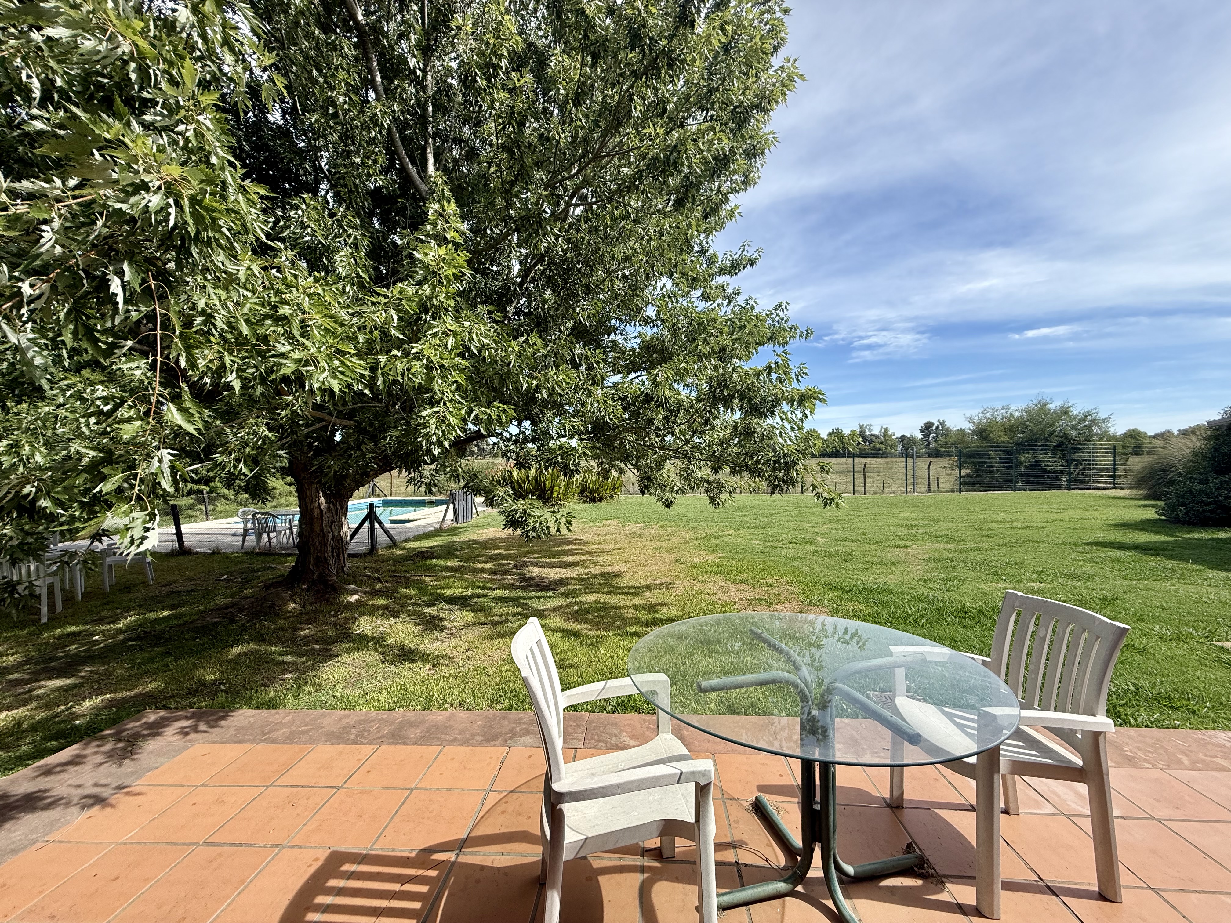 Living con hogar a leña y comedor, con vista al jardín y al campo lindero donde caballos
