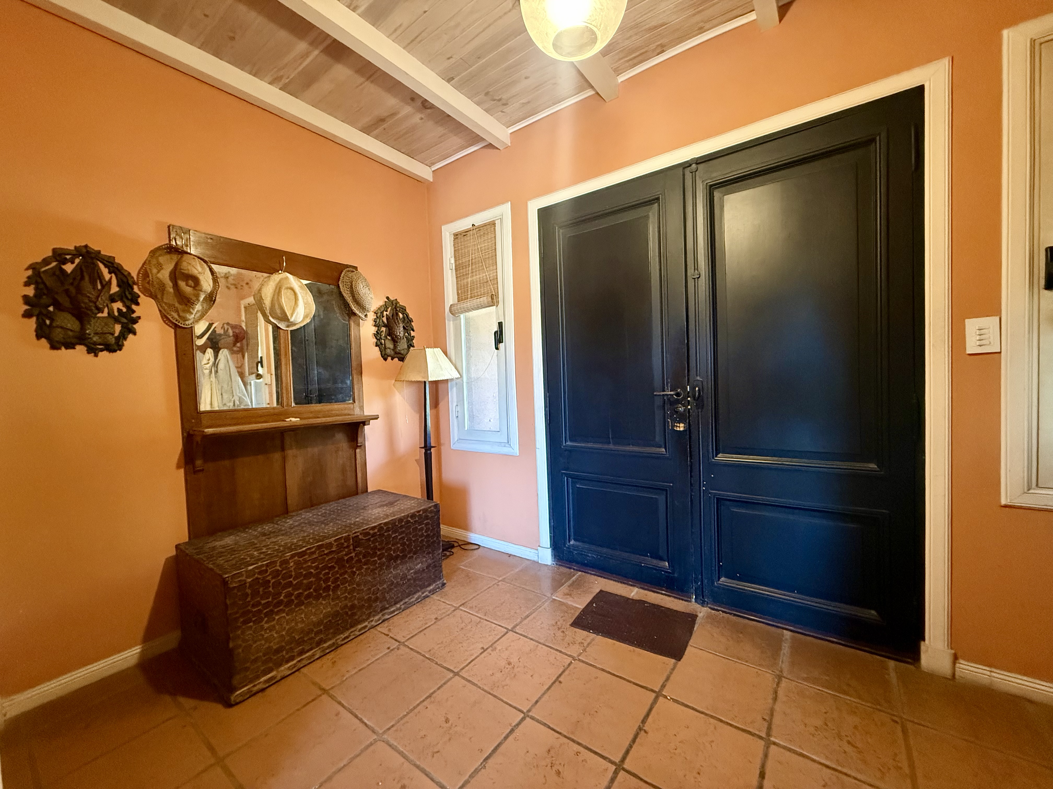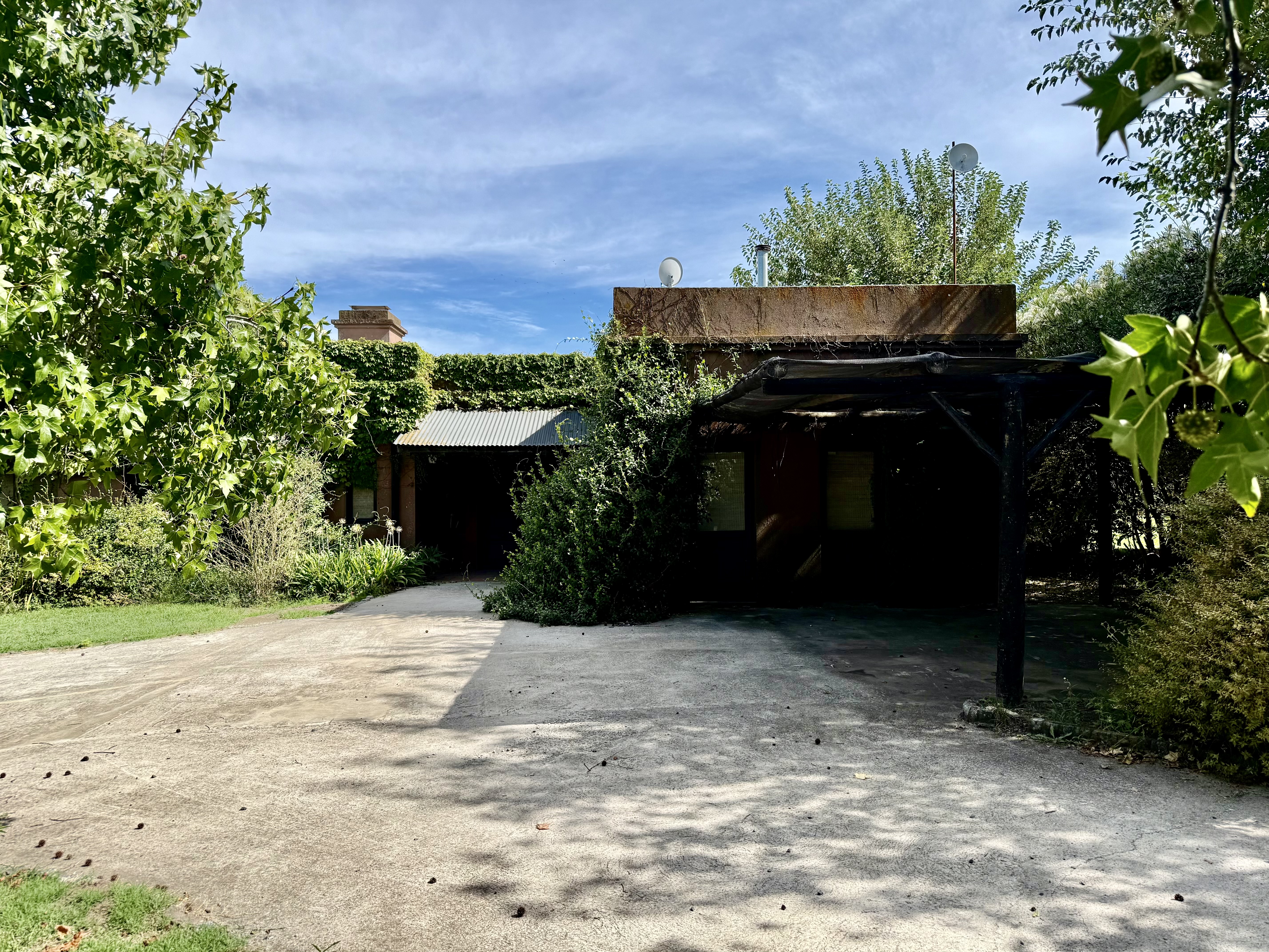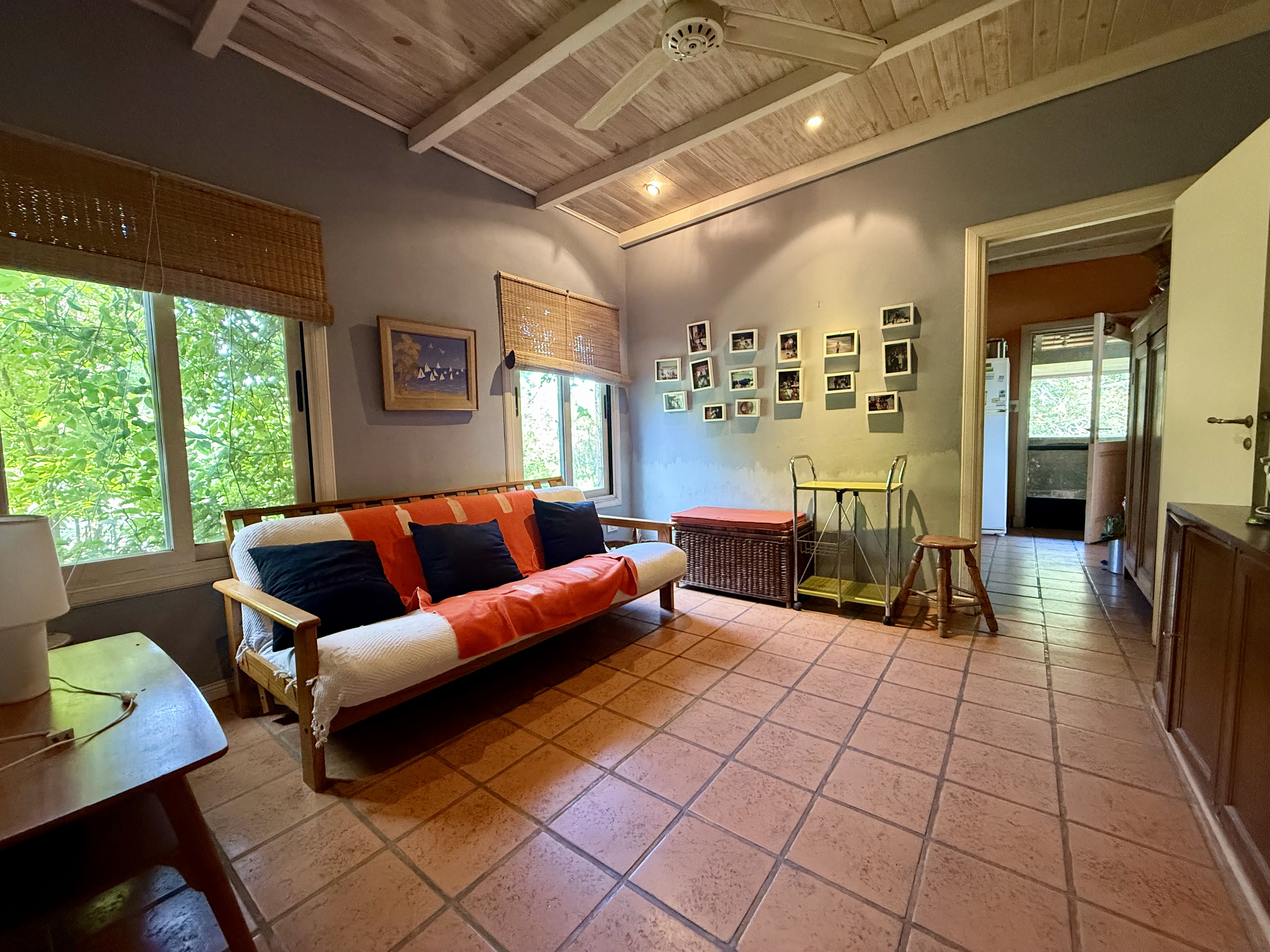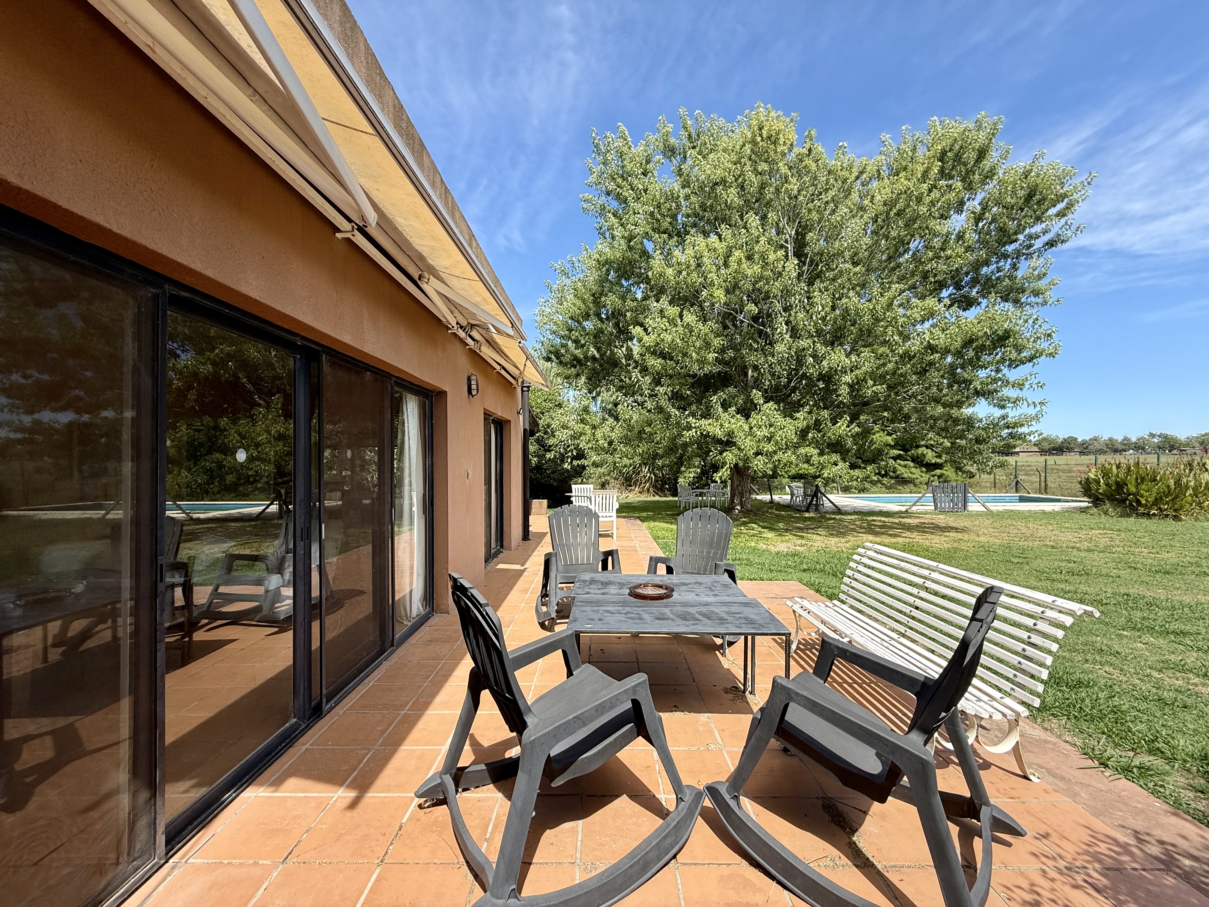 Living con hogar a leña y comedor, con vista al jardín y al campo lindero donde caballos