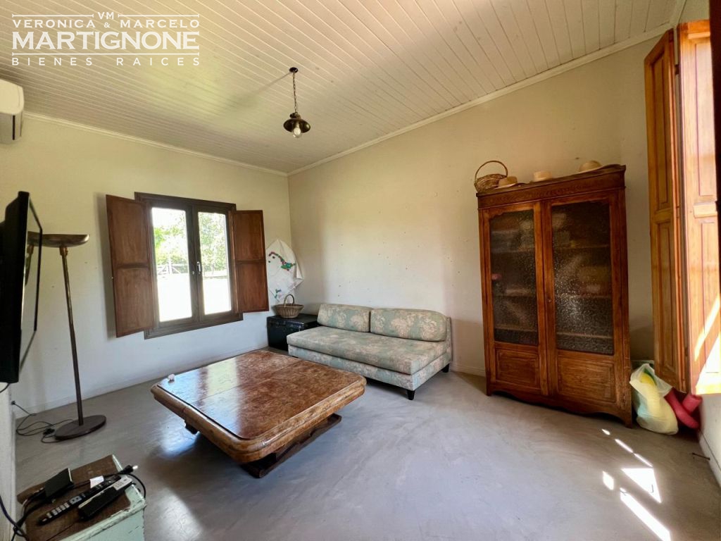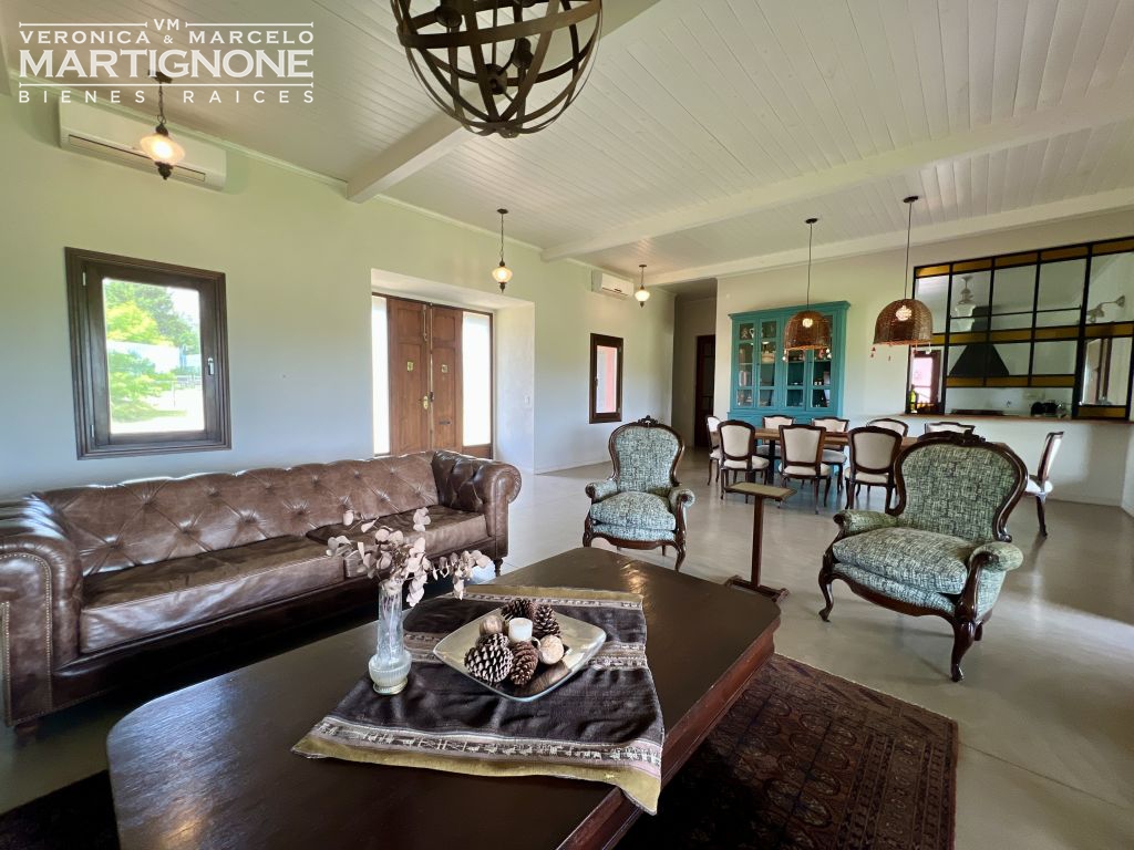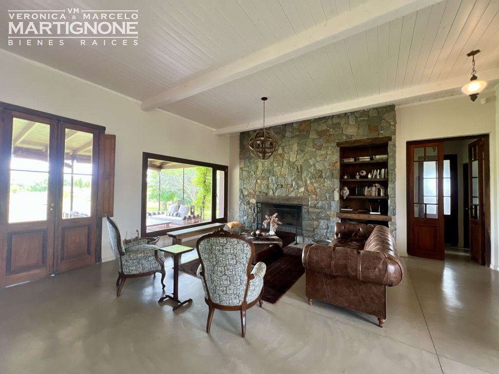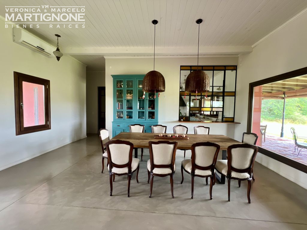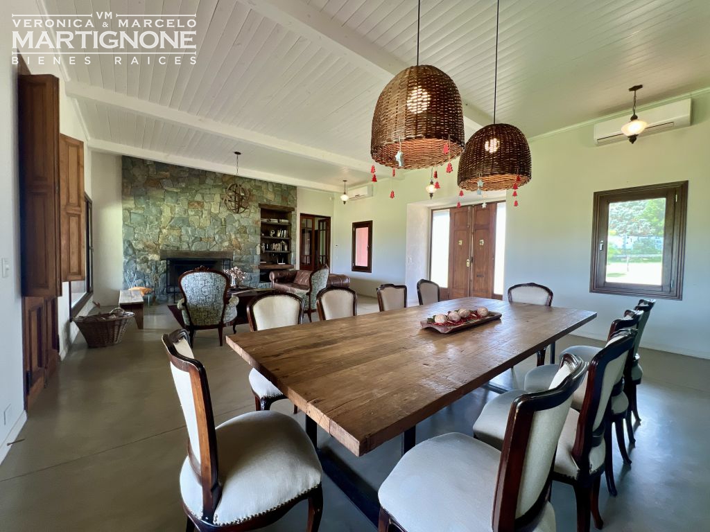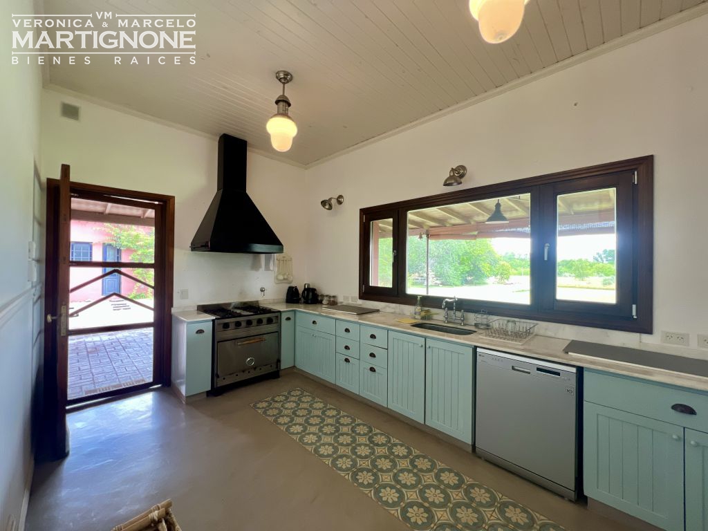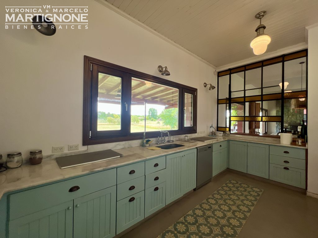 Living comedor con hogar a leña, cocina con pasaplatos tipo ventana de hierro con vidrio repartido, con cocina semi industrial, lavaplatos y heladera.