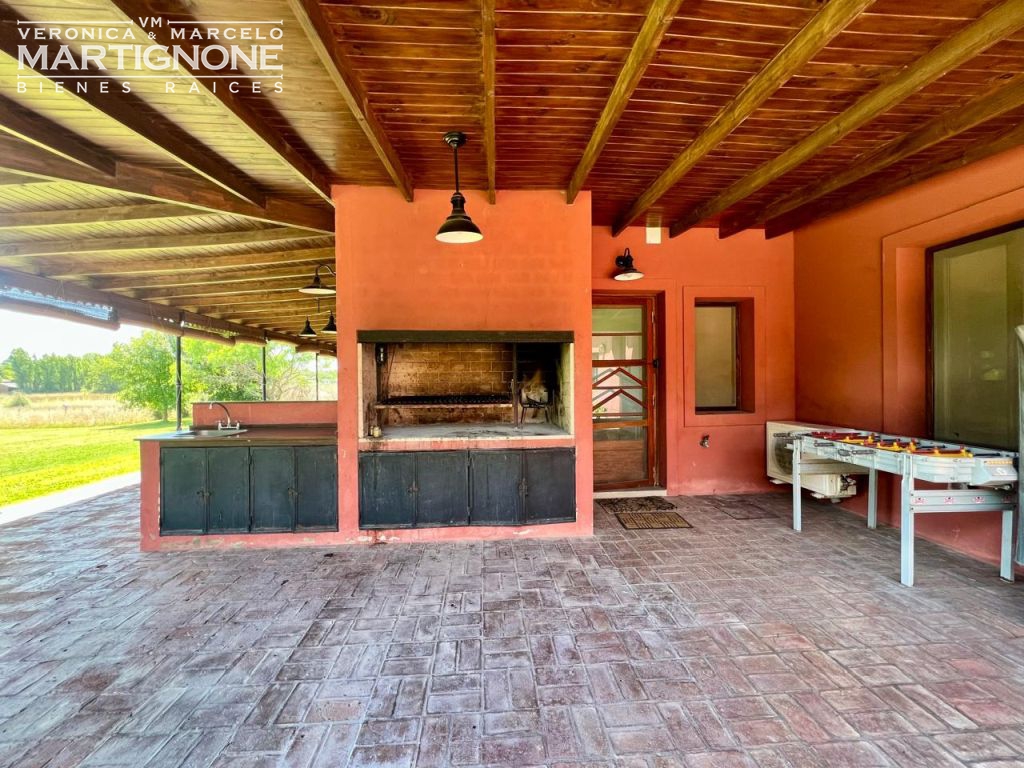 Gran galería en forma de letra L, de un lado está la parrilla con mesada de madera con bacha y el resto con mesa con bancos y sillones y mesa ratona.