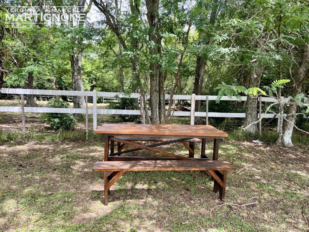 Arboles de sombra que generan distintos lugares de estar, para disfrutar del paisaje al aire libre. Mesa con bancos.