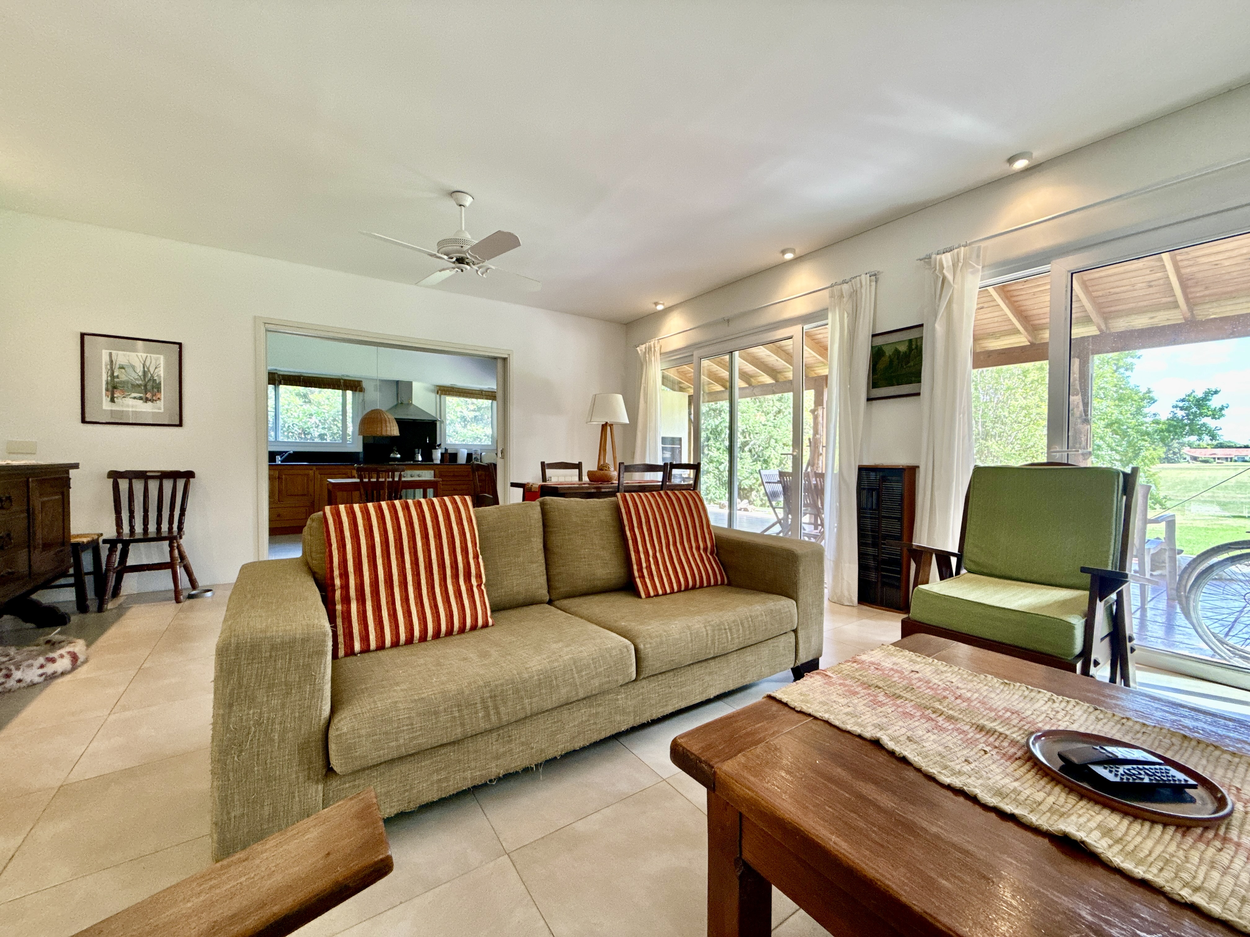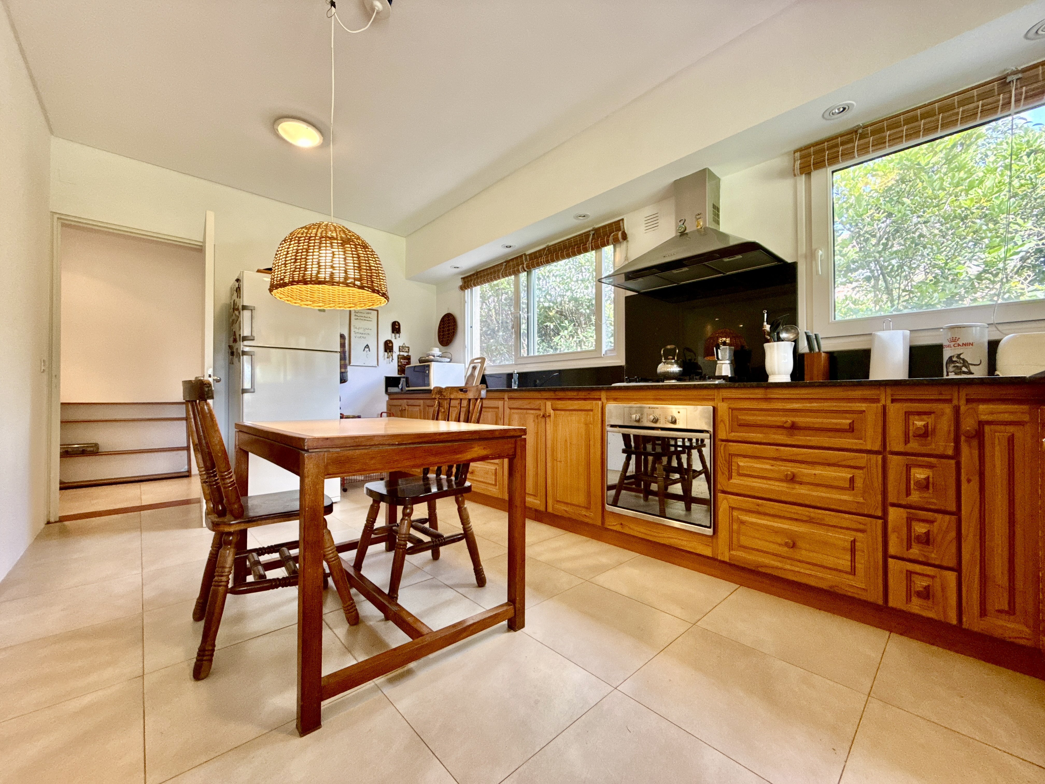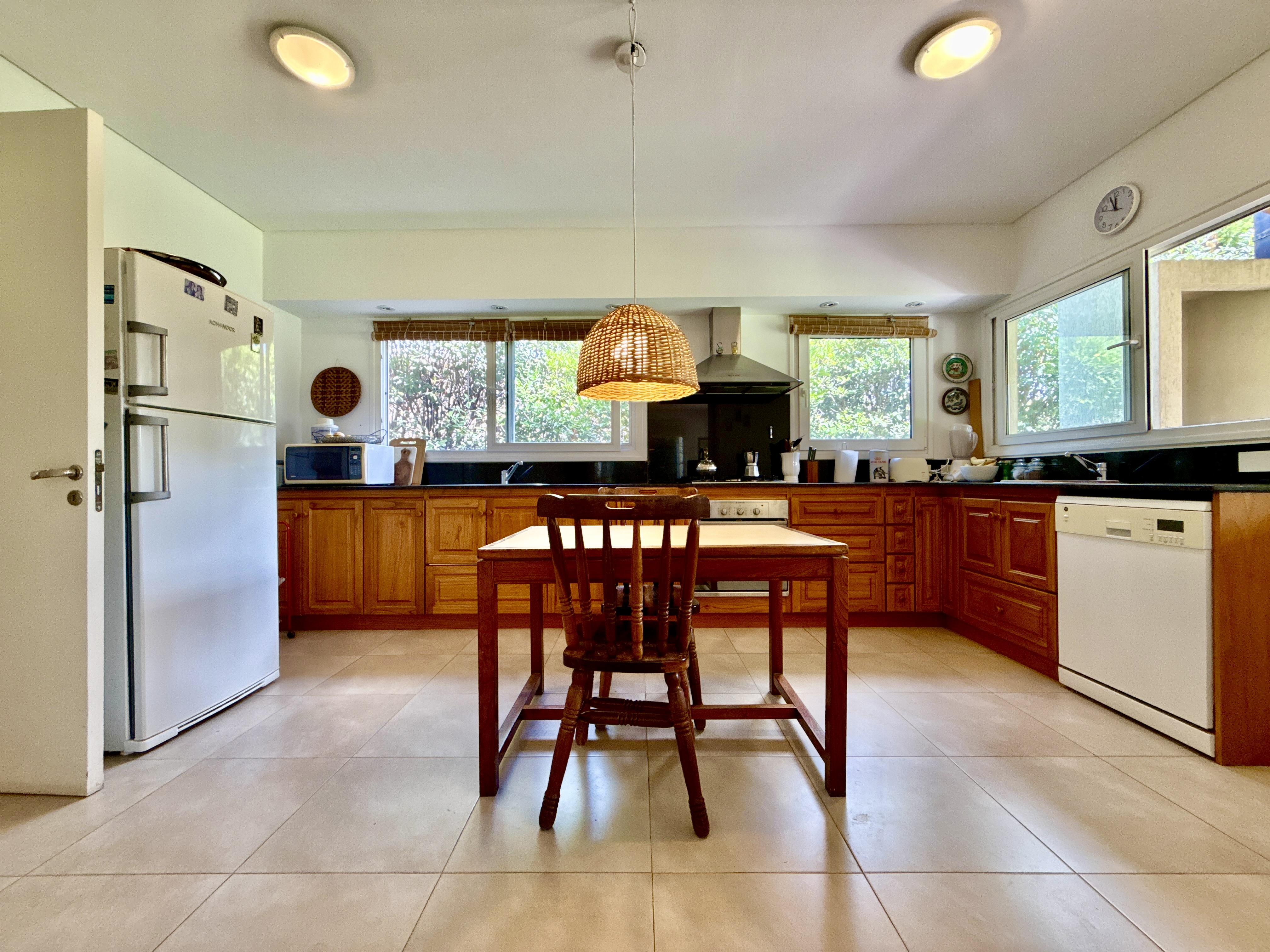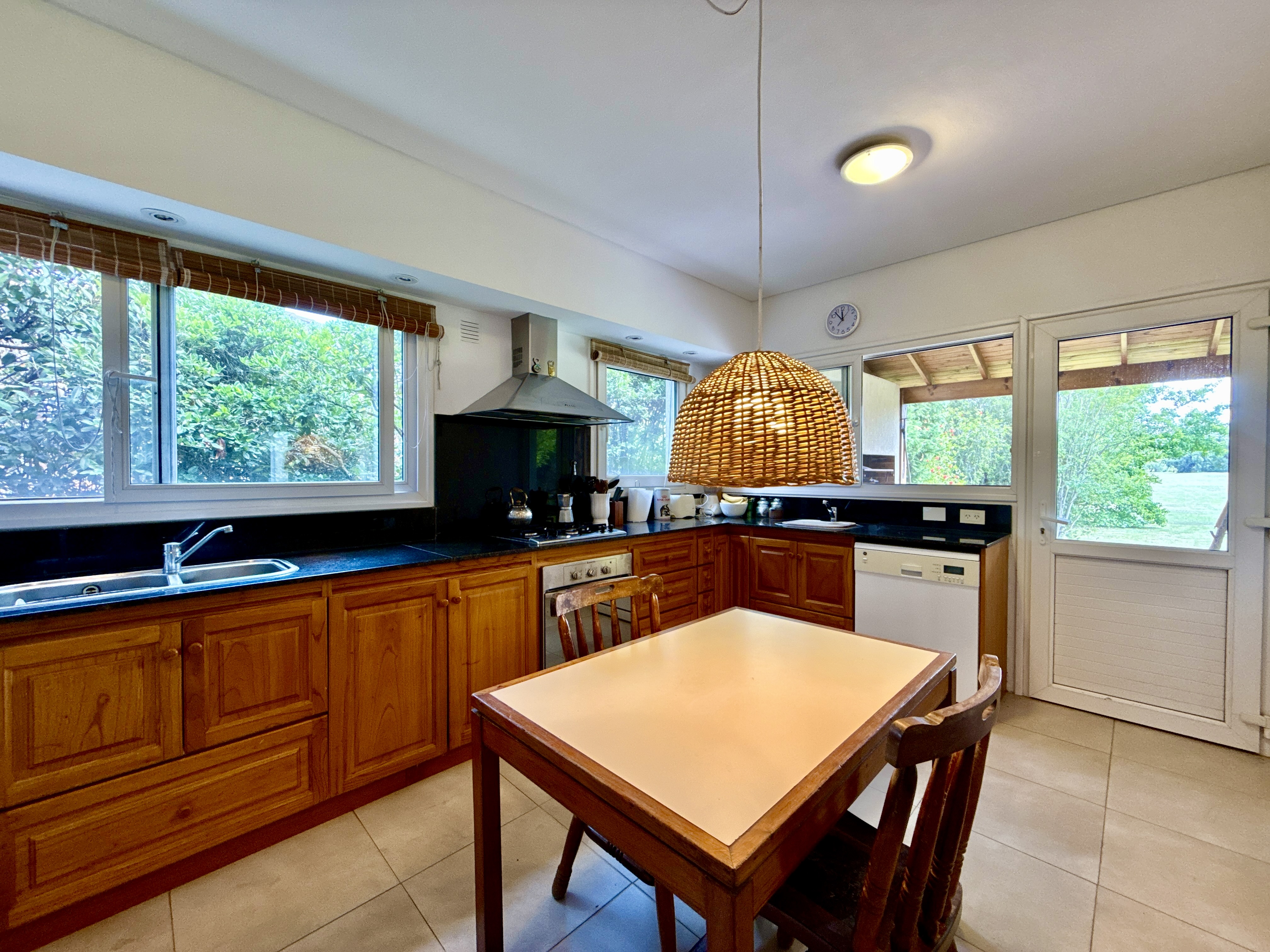 Porch y hall de ingreso. living comedor con amplios ventanales y salida al jardín. Cocina integrada o independiente mediante puerta corrediza que permite dividir o unificar los espacios, con doble circulación, mesada y bajo mesada de madera, instalación para lavavajilla, con salida a la parrilla y galeria.