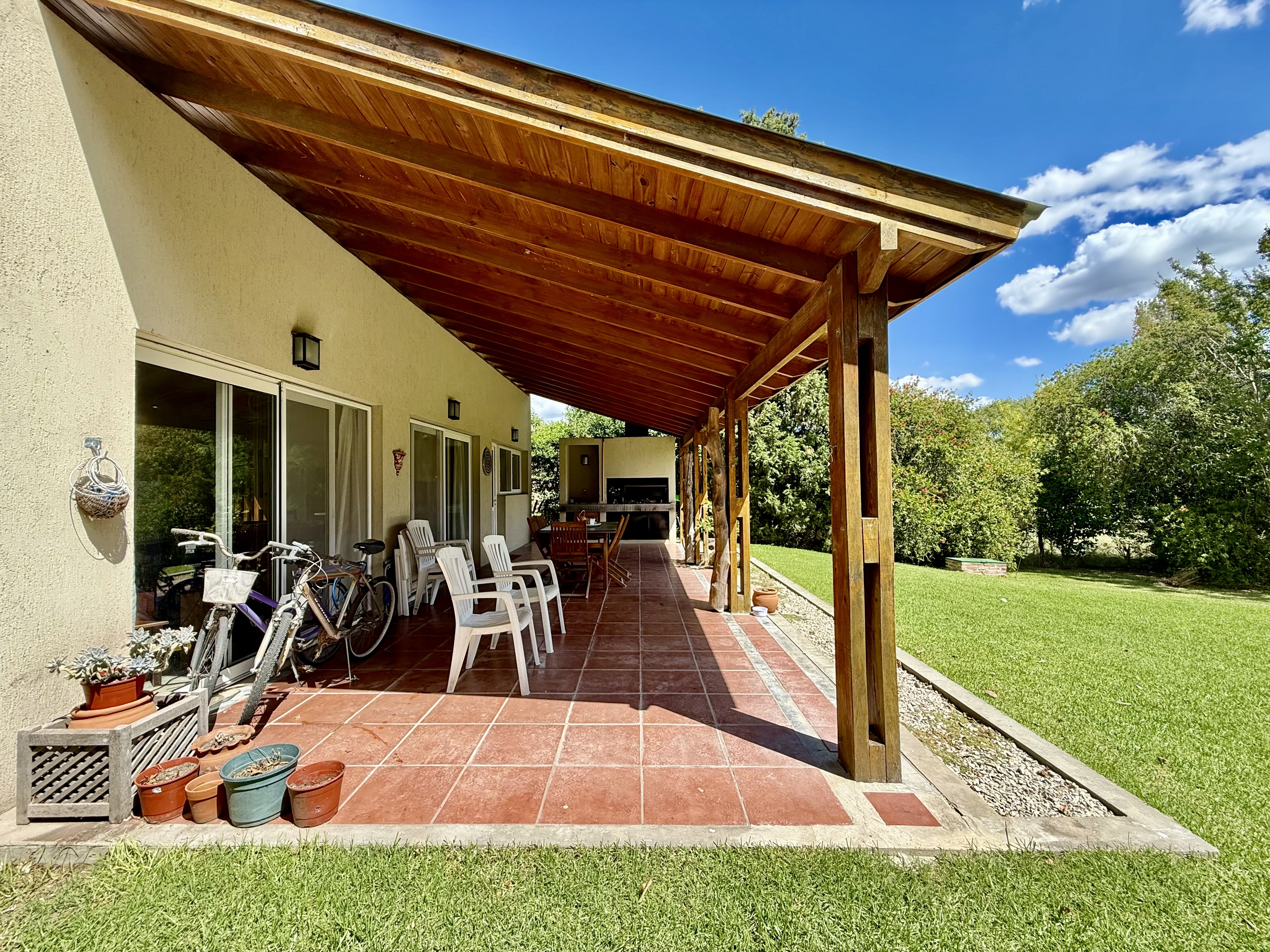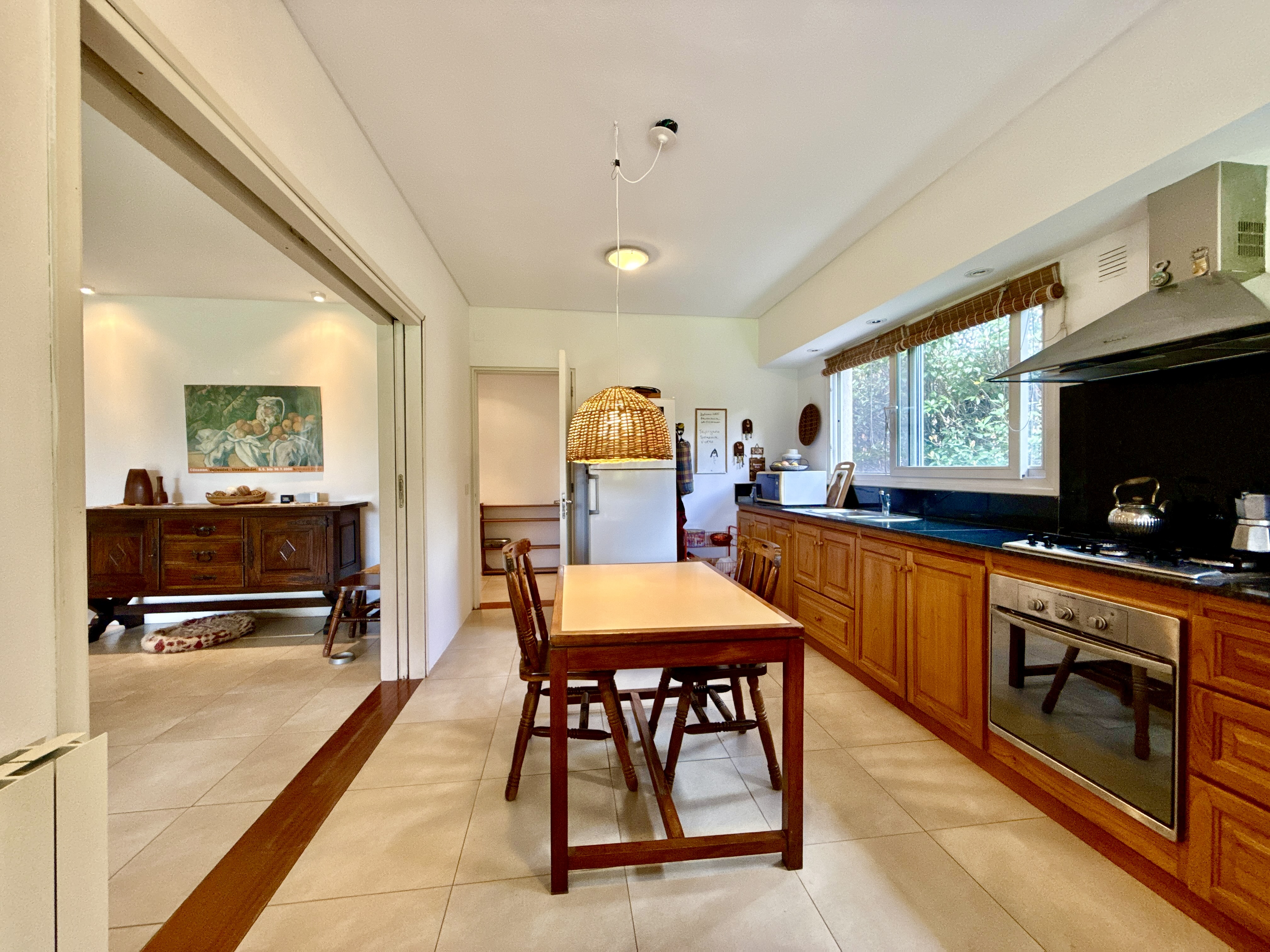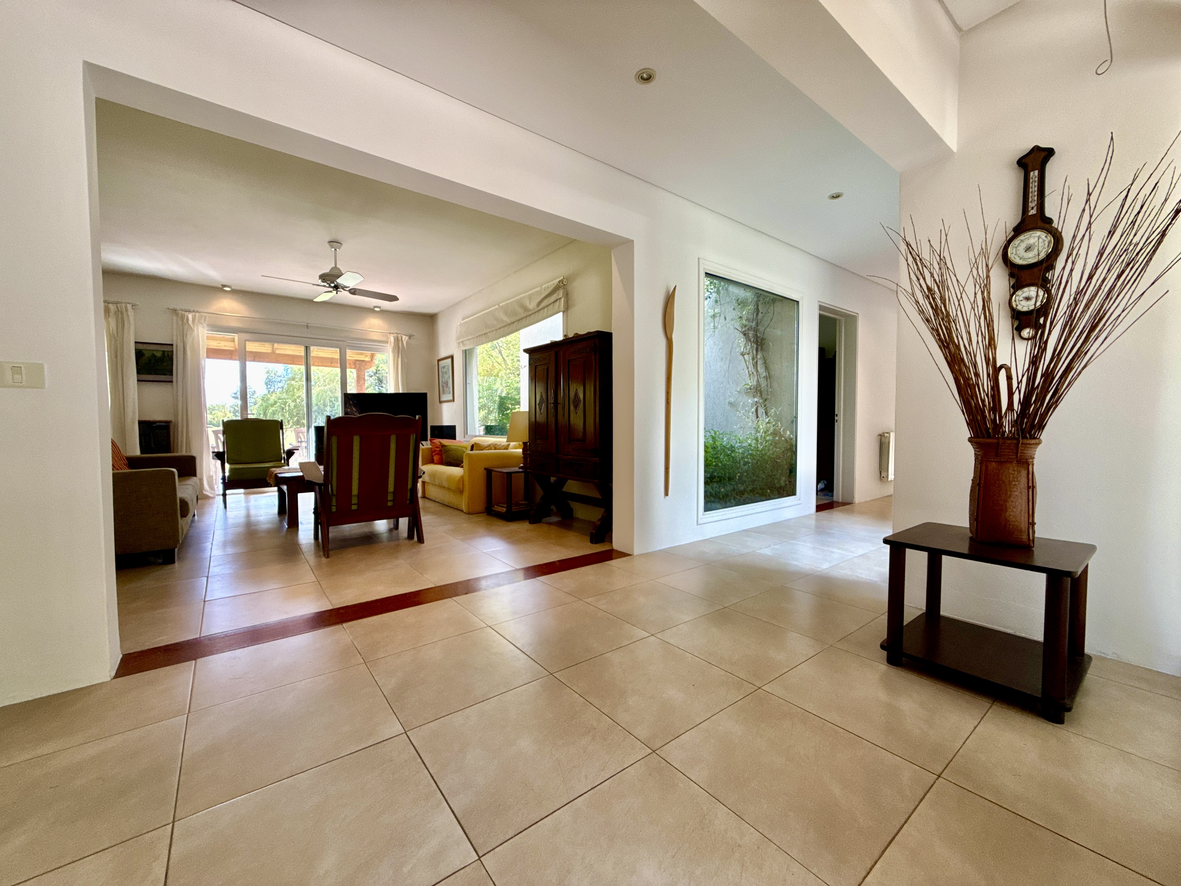 Porch y hall de ingreso. living comedor con amplios ventanales y salida al jardín. Cocina integrada o independiente mediante puerta corrediza que permite dividir o unificar los espacios, con doble circulación, mesada y bajo mesada de madera, instalación para lavavajilla, con salida a la parrilla y galeria.