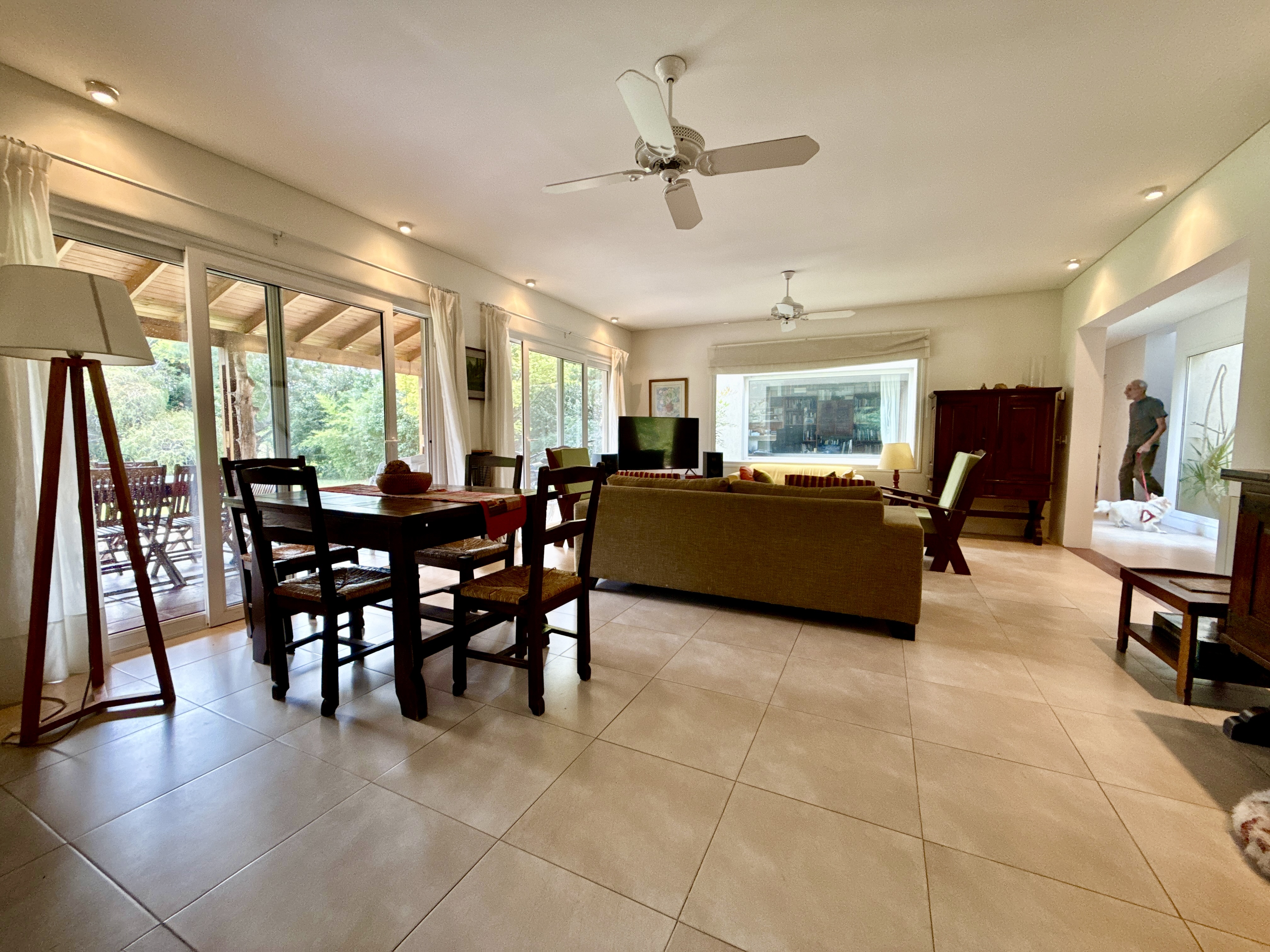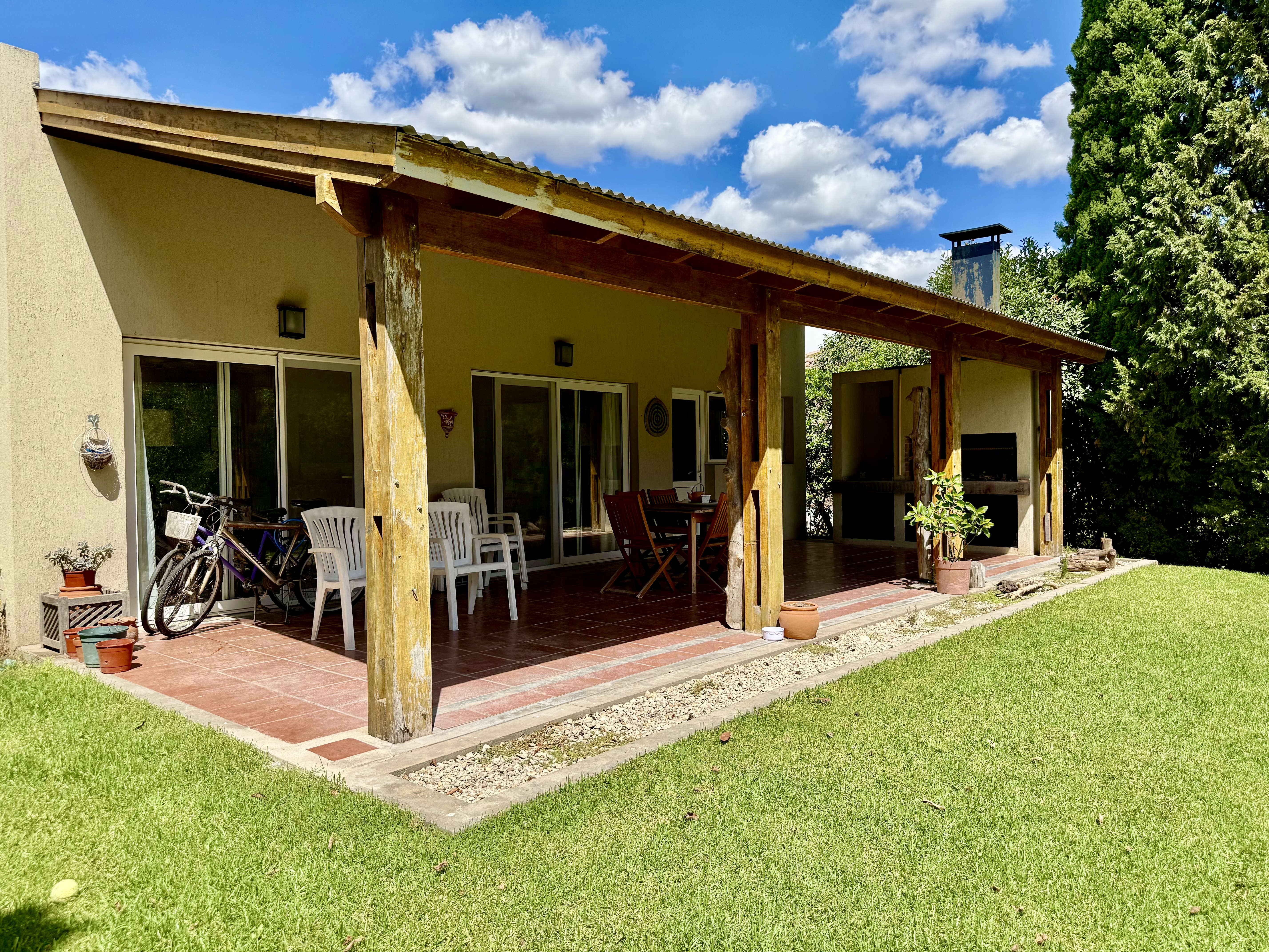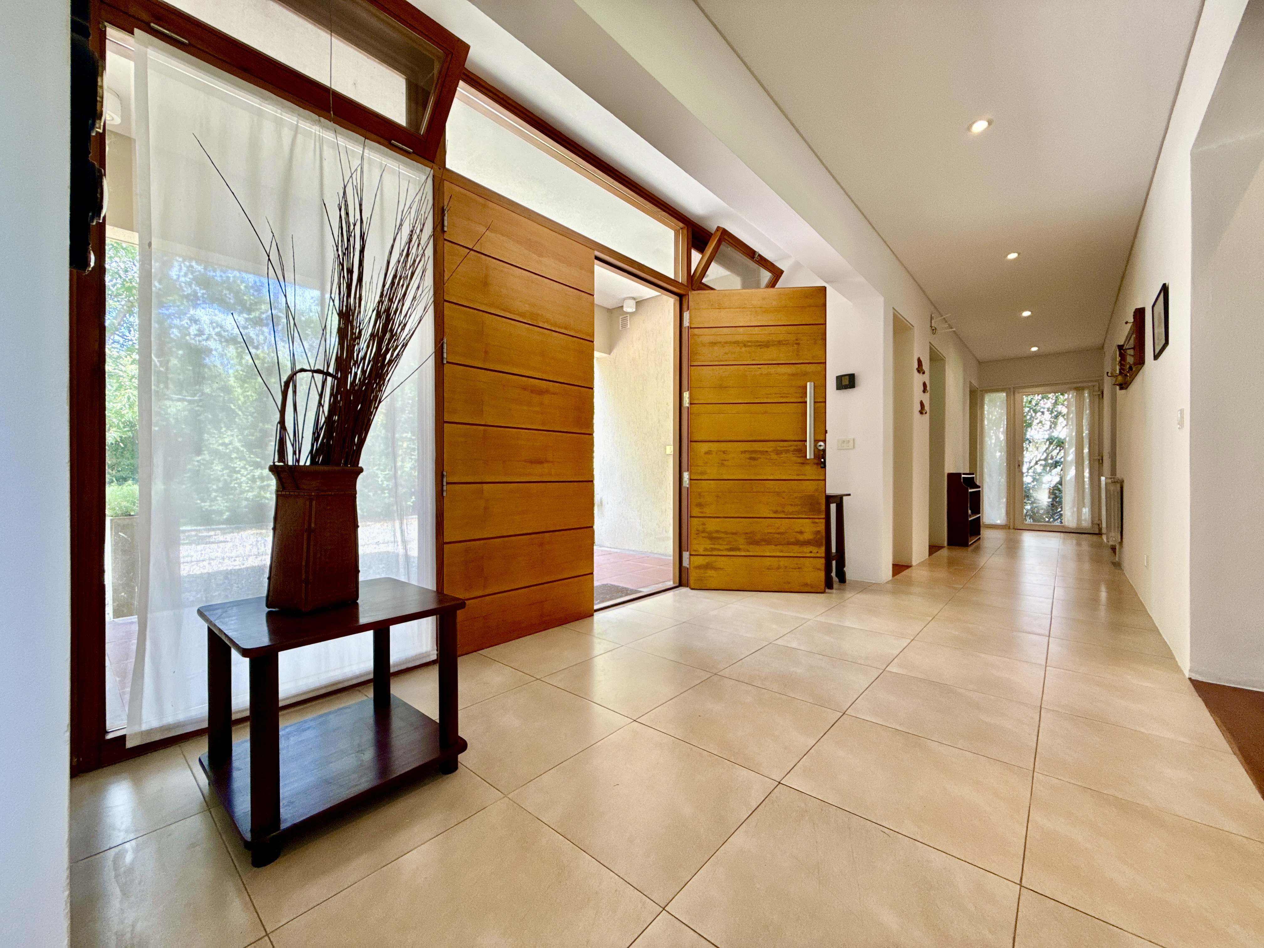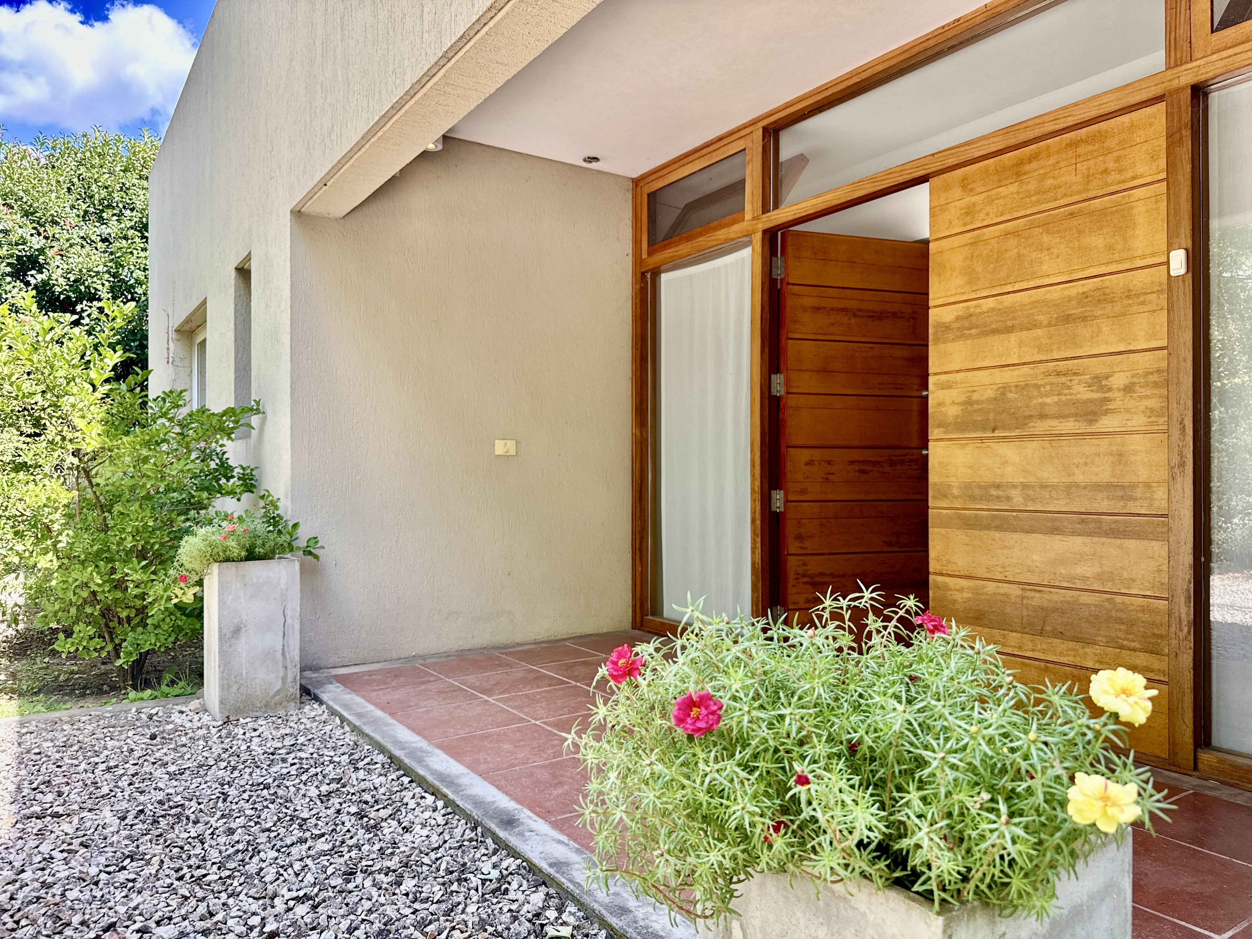 Porch y hall de ingreso. living comedor con amplios ventanales y salida al jardín. Cocina integrada o independiente mediante puerta corrediza que permite dividir o unificar los espacios, con doble circulación, mesada y bajo mesada de madera, instalación para lavavajilla, con salida a la parrilla y galeria.