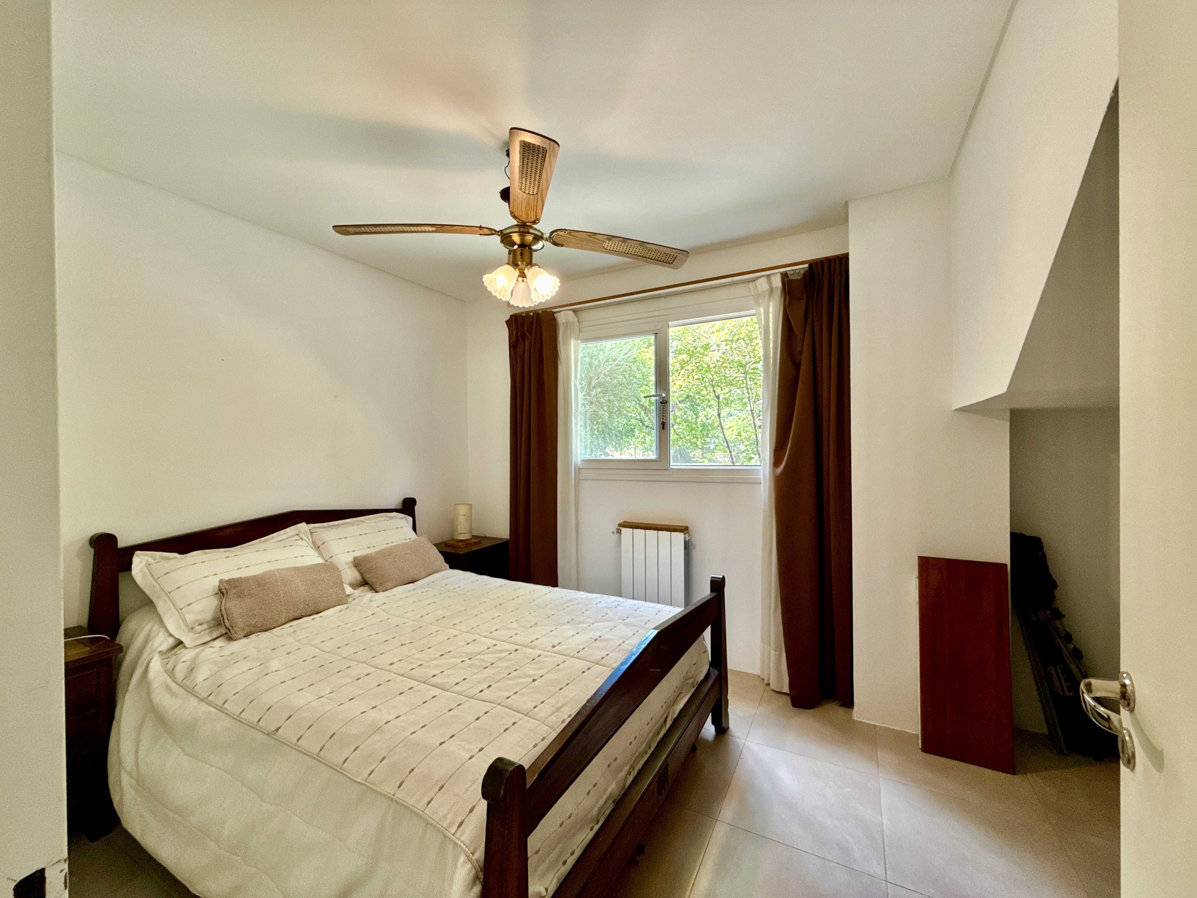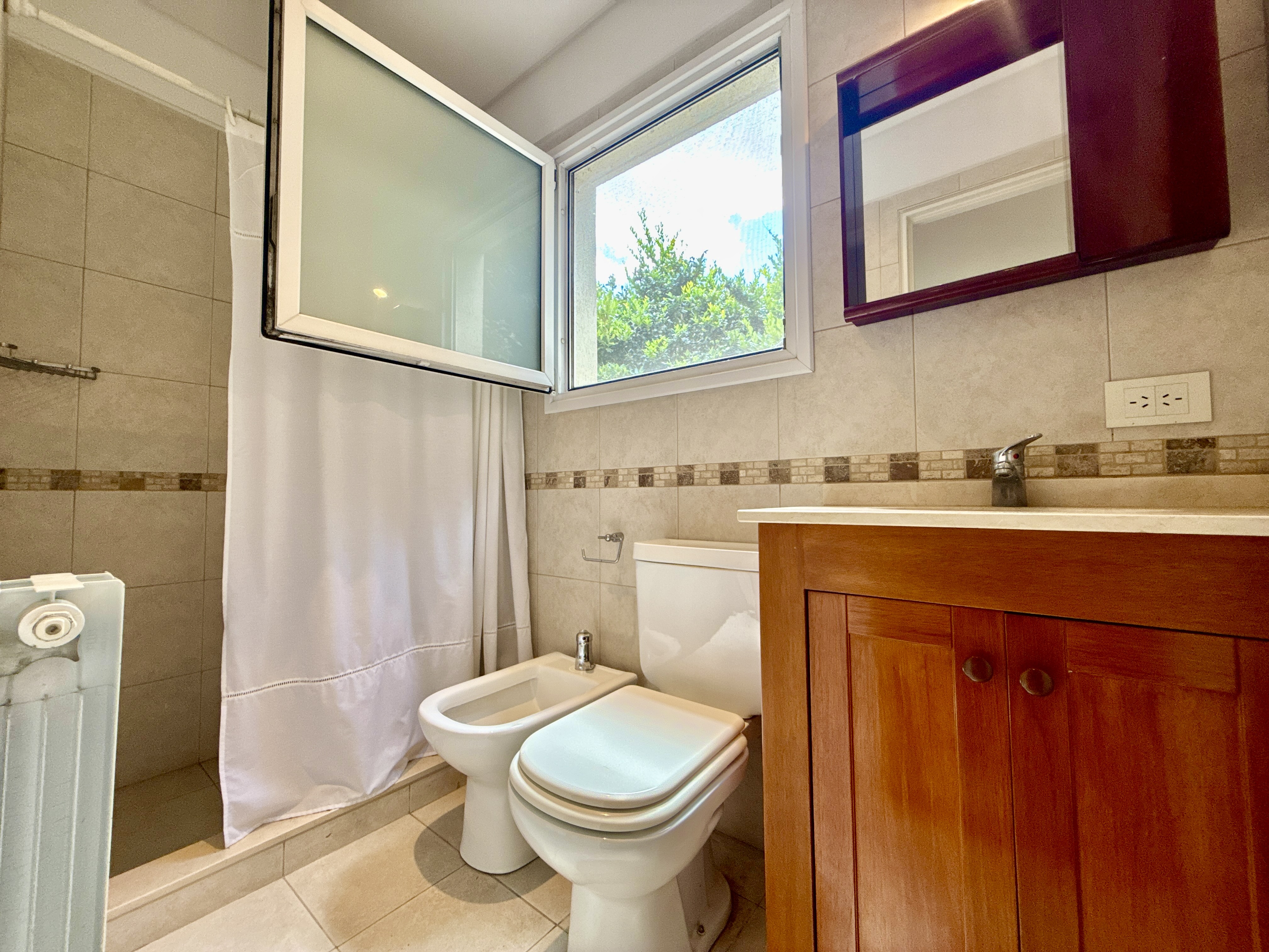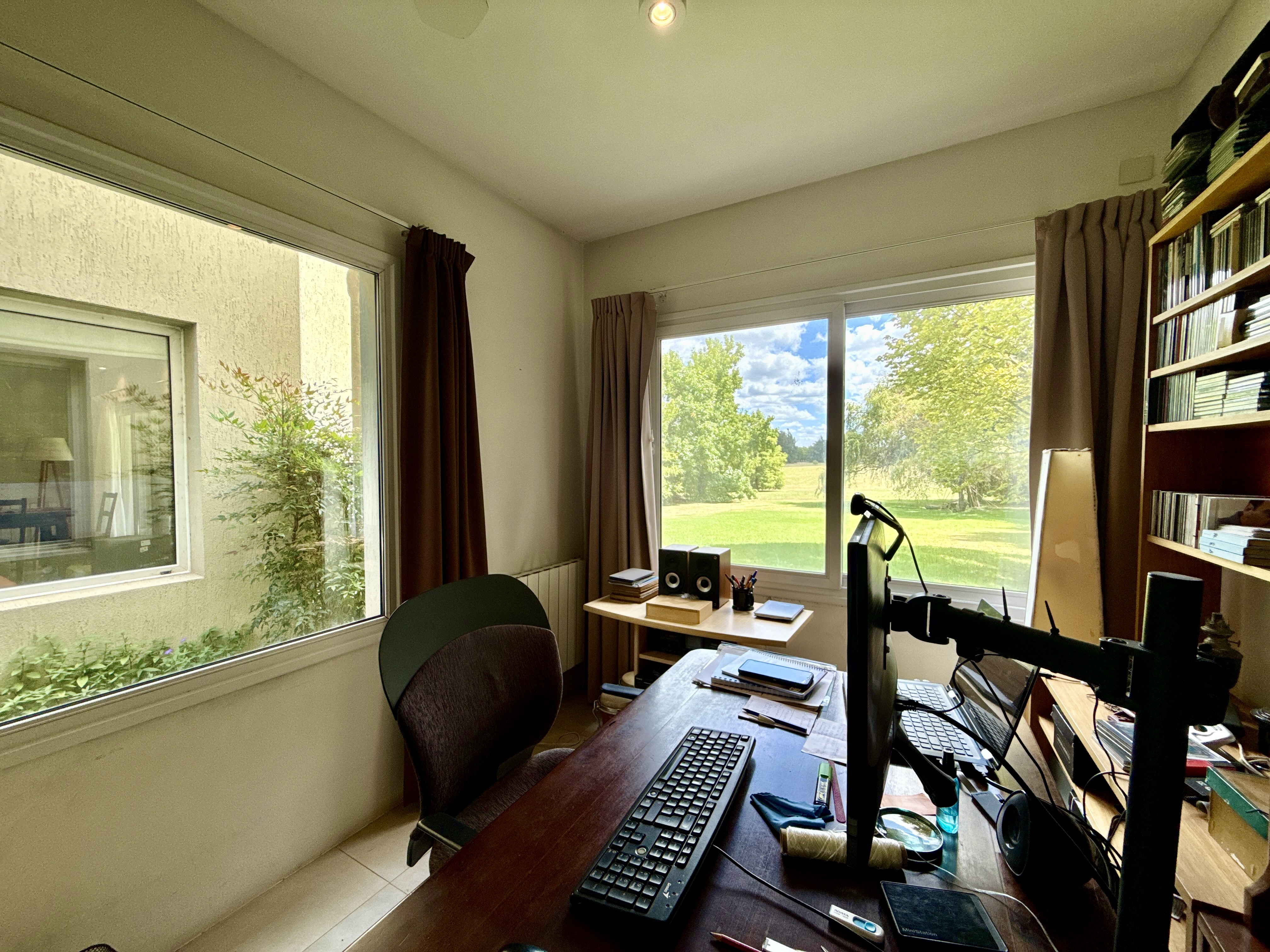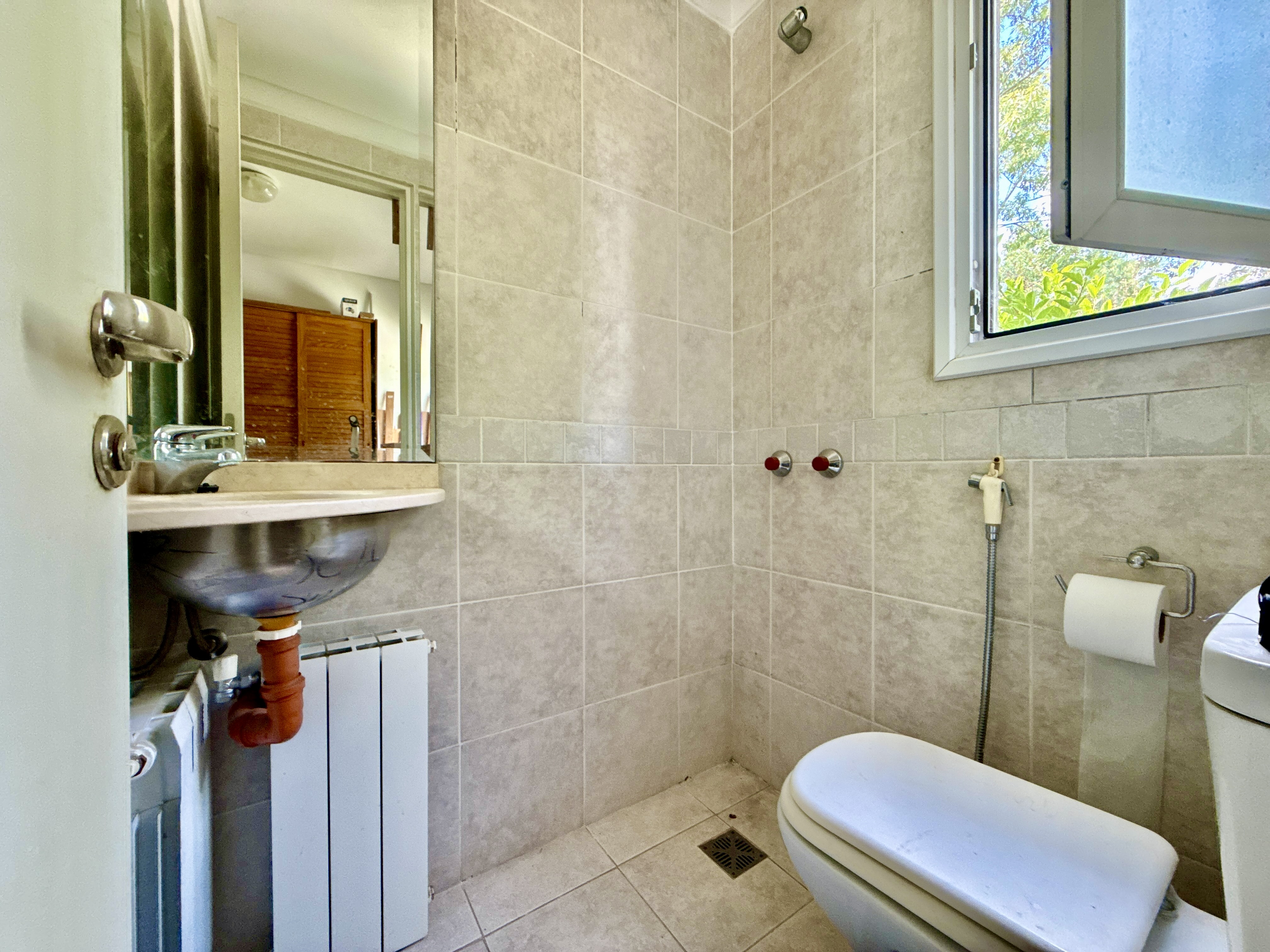 Planta baja: 2 dormitorios, uno de cuales tiene con placard. Baño completo y escritorio con vista muy linda al jardín con arboles y pulmón verde.