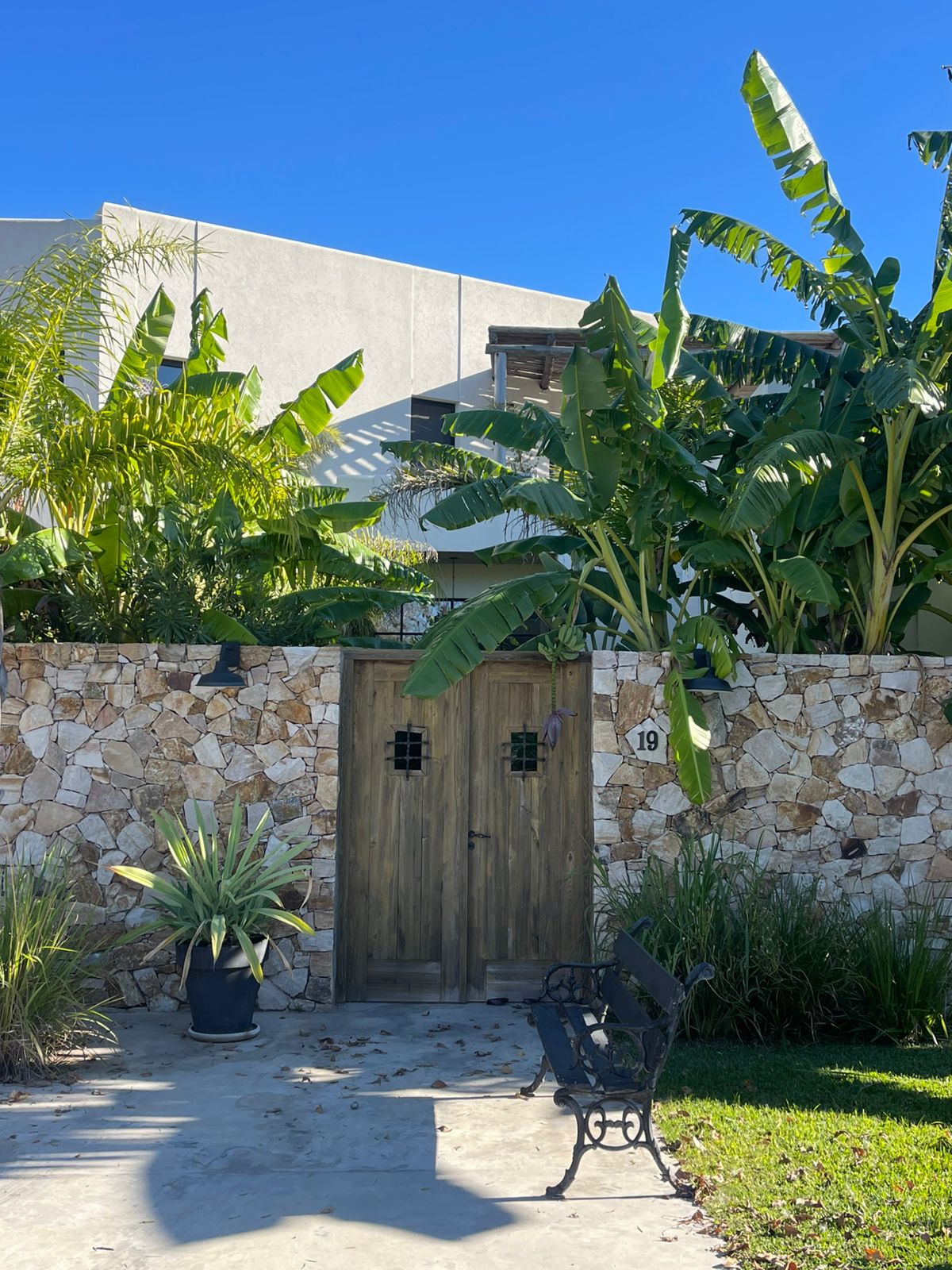 El ingreso con un frente muy atractivo, con muro de piedra y portón de madera rustica, patio interno con jardín, que aporta luz natural a los distintos ambientes.