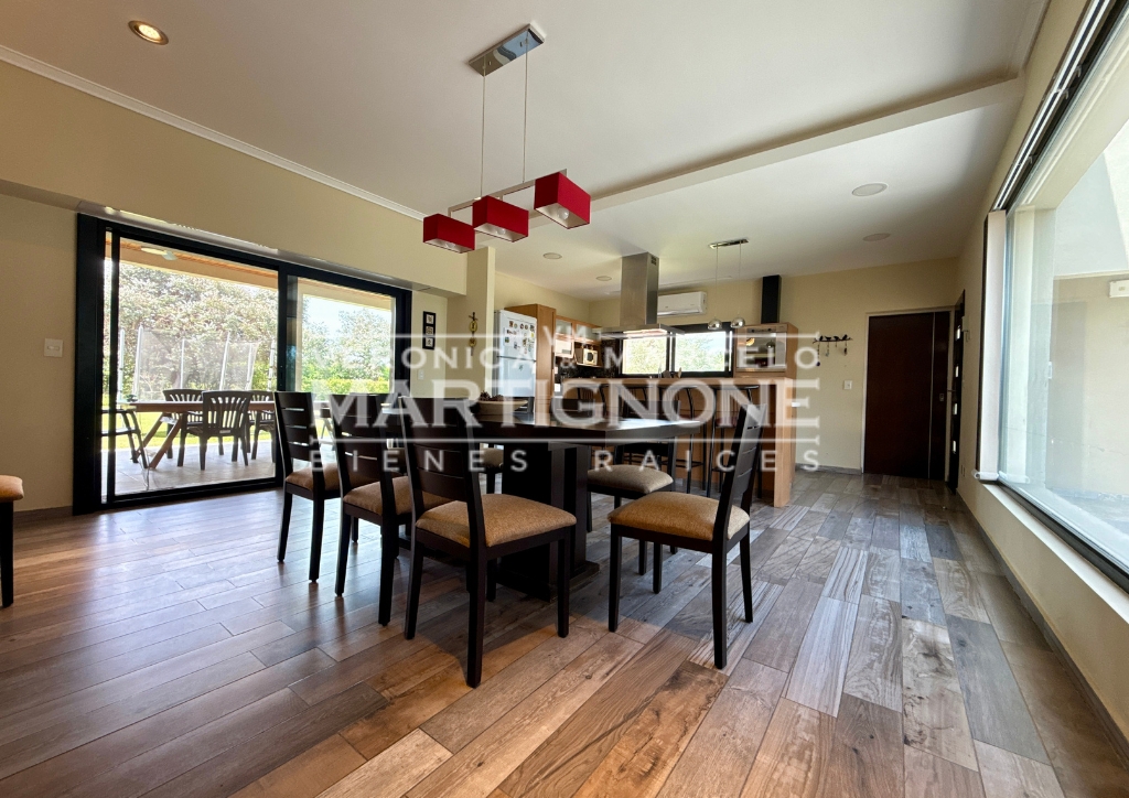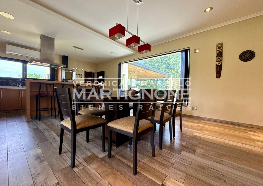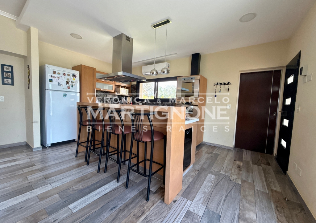 Cocina comedor, con isla desayunador, salida al jardín y galería, y acceso directo desde la cochera cubierta.