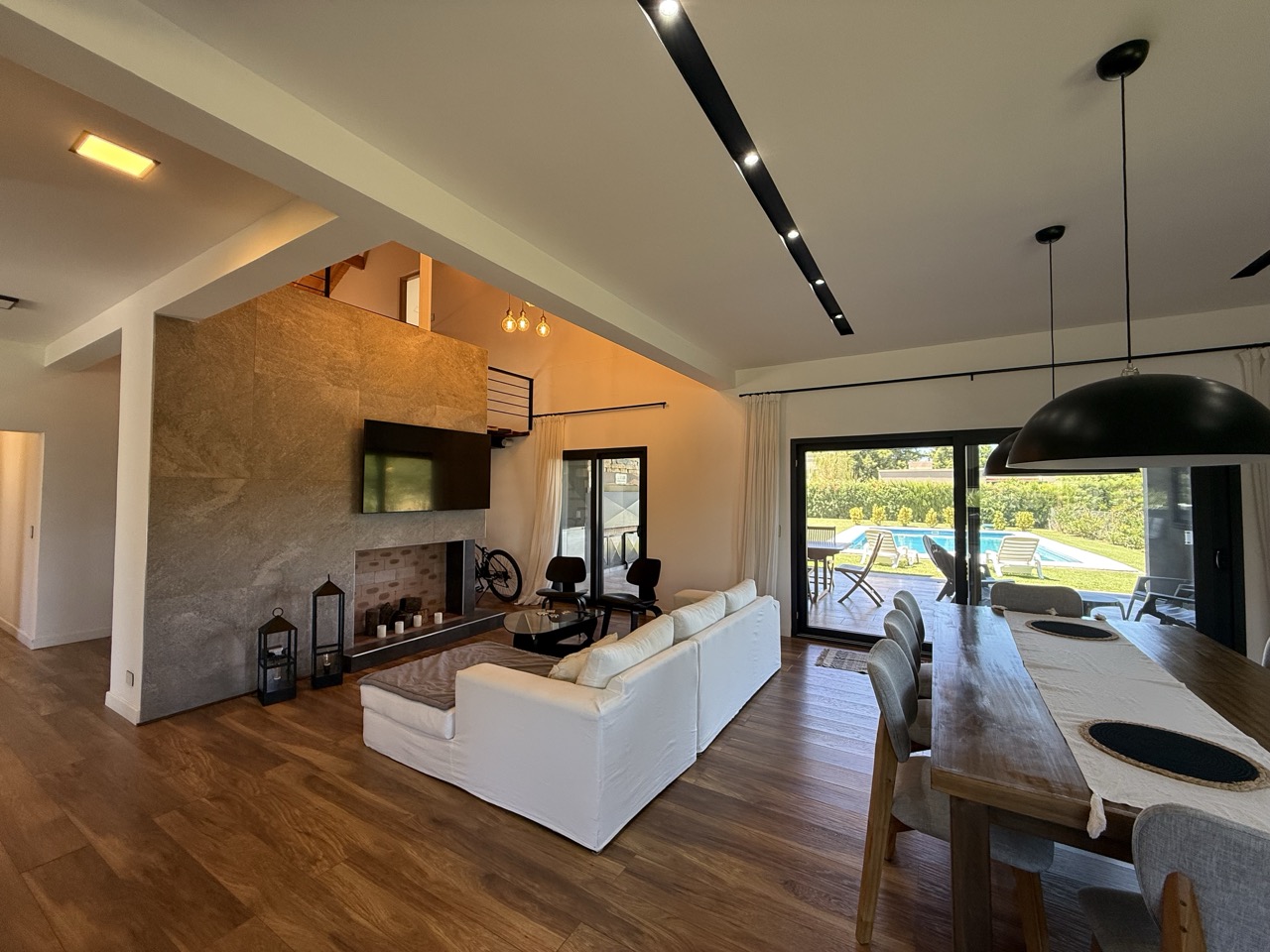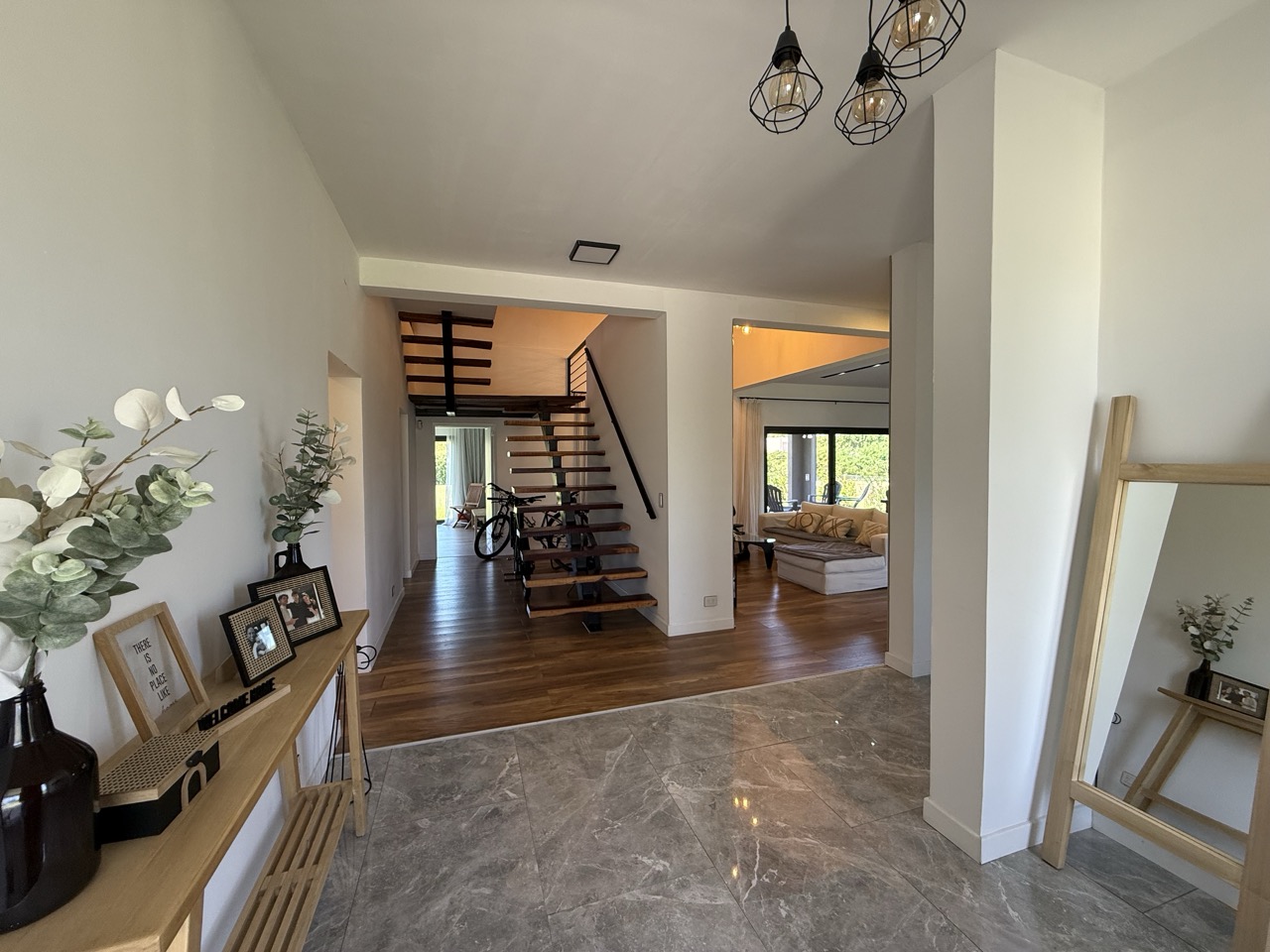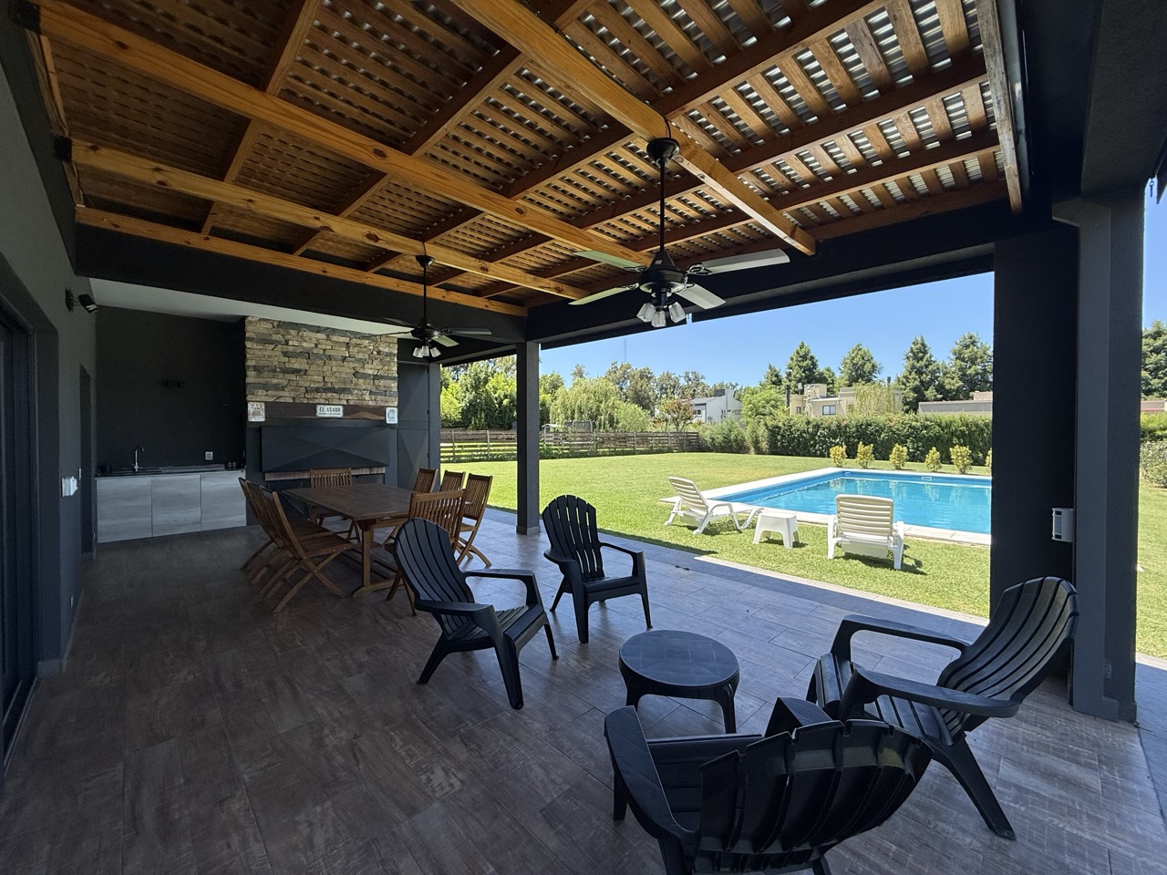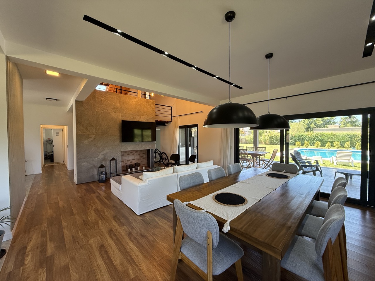 Planta Baja: Porch. Amplio hall de entrada. Living comedor con hogar leña, con vista al jardín y pileta de natación.