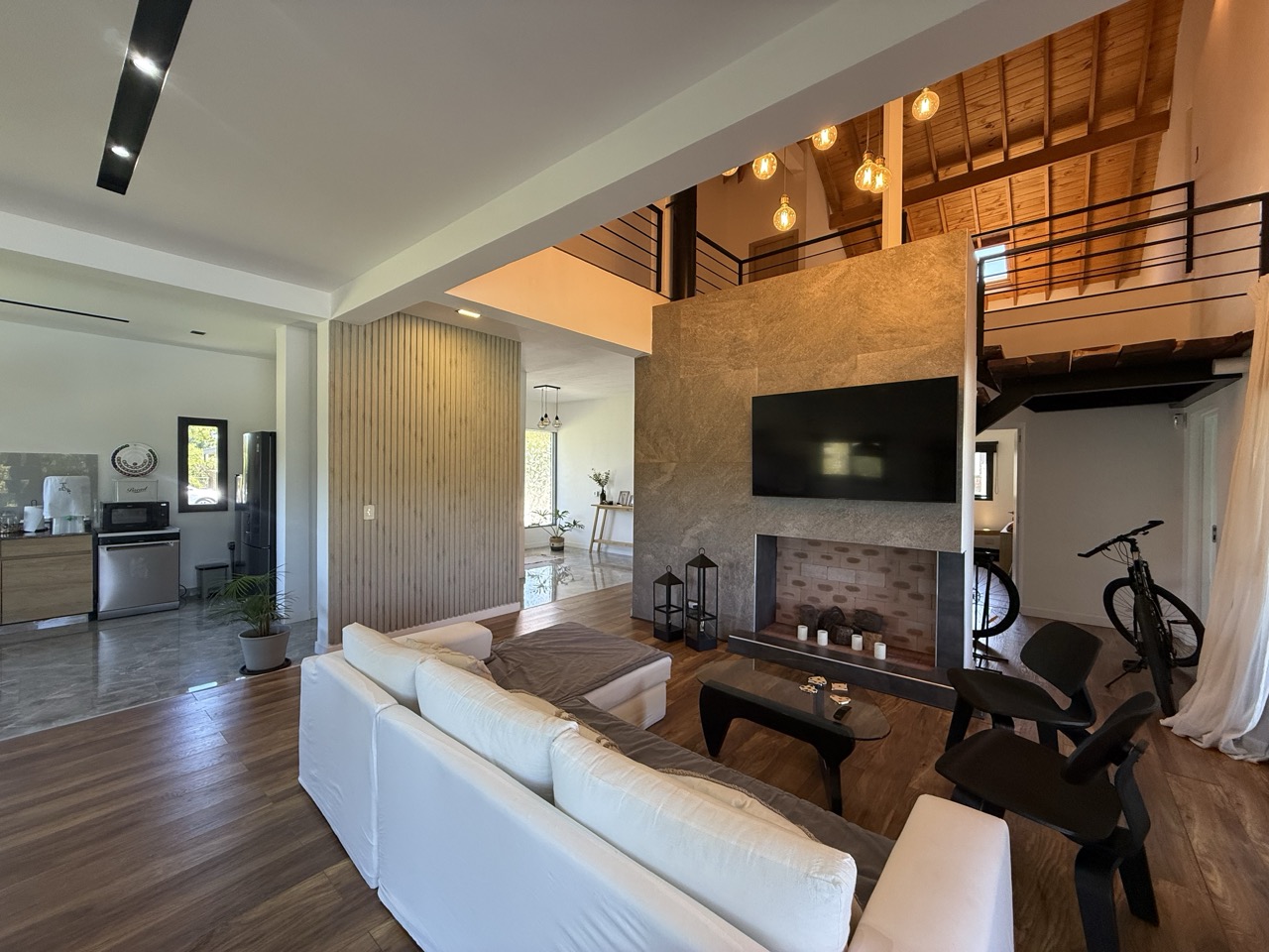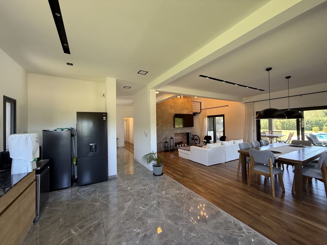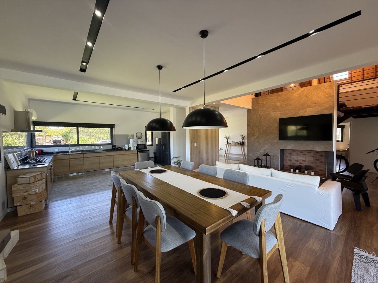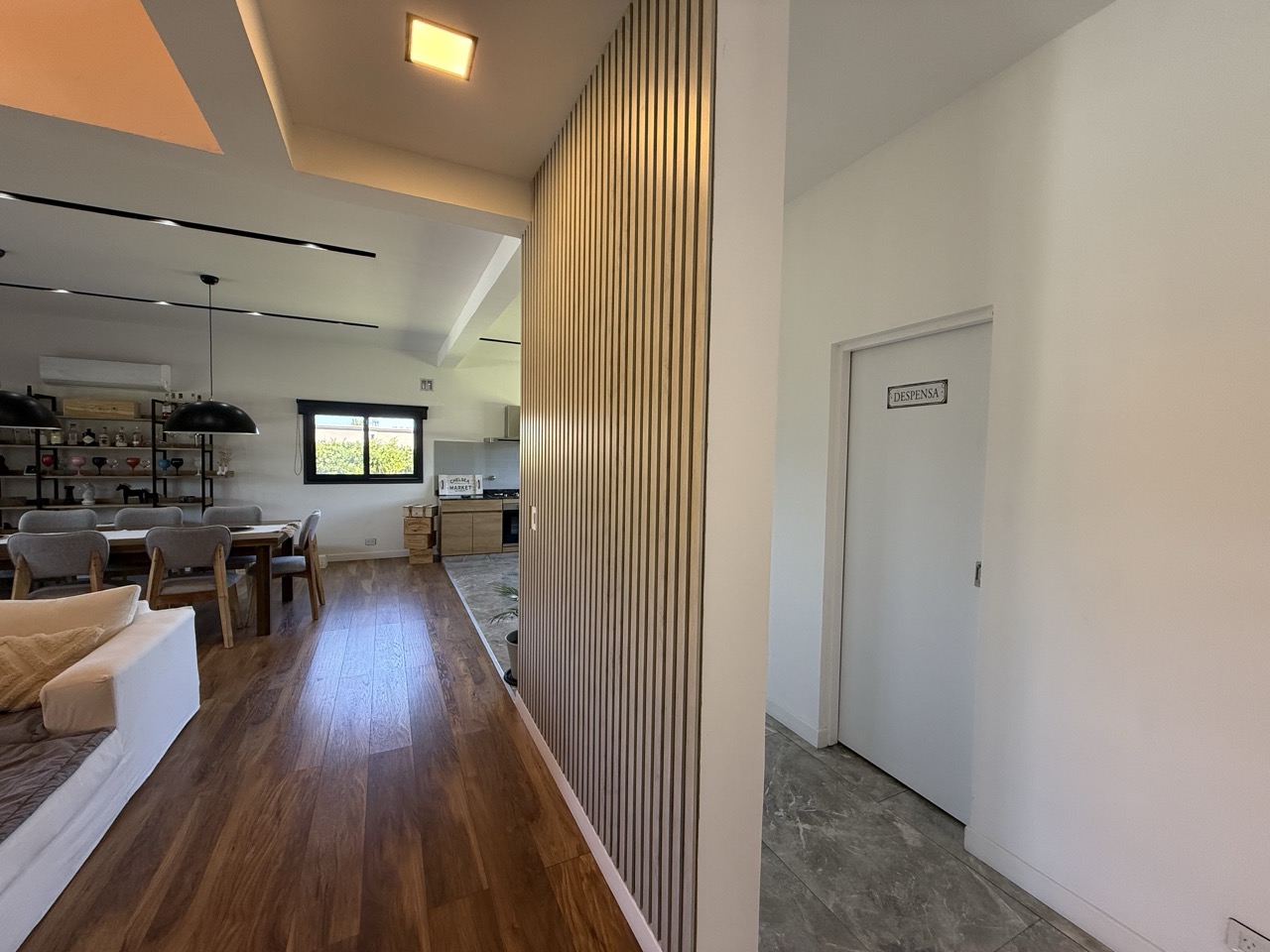 Pared entre cocina y living comedor con detalles de MDF.