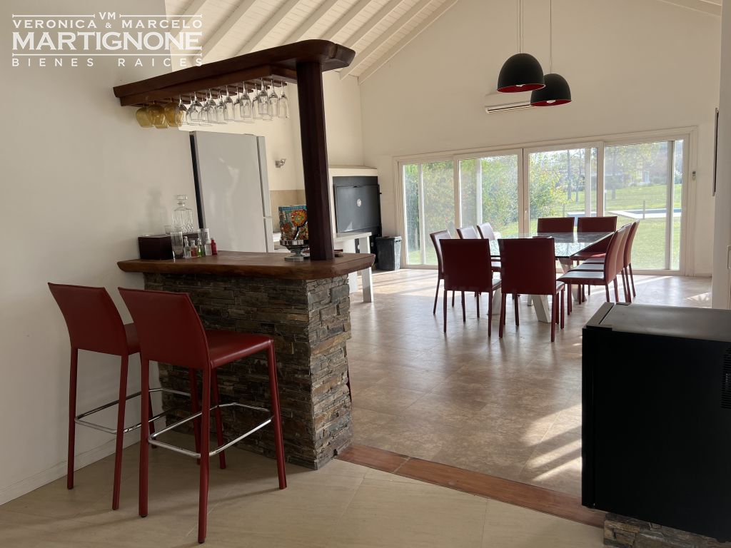 Porch, ingreso directo a living comedor con vista abierta al jardín, pileta y espacio verde común, separado por una barra amplia cocina comedor con parrilla incorporada, con conexión para lavaplatos en la cocina y barra desayunador. Pequeño cuarto ideal para despensa o 2da heladera o freezer.