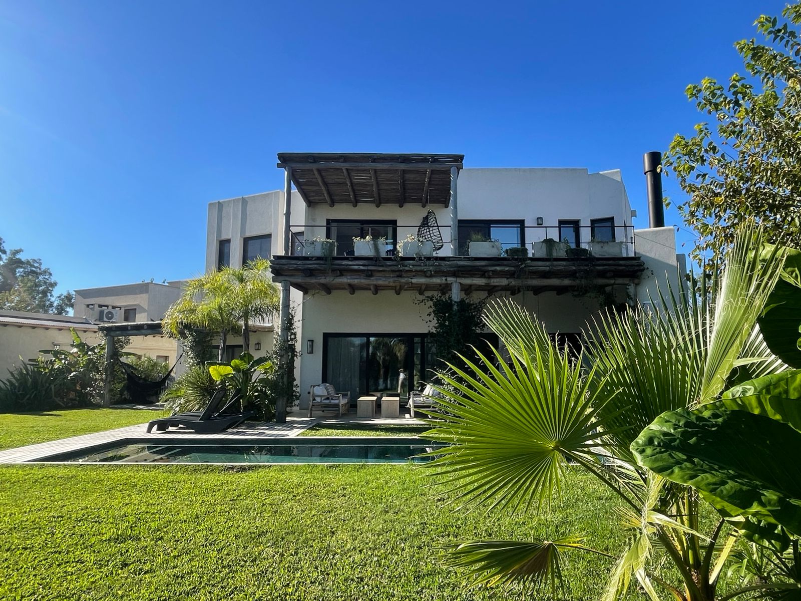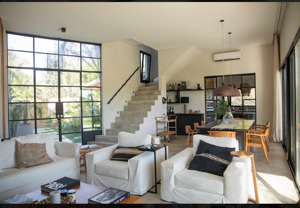 Casa de estilo moderno en dos plantas, compuesta de: Planta Baja: porc, amplio hall de entrada con vista al jardín, comedor con hogar a leña, todo en doble altura, muy luminoso, toilette, amplio playrrom con piso de madera, cocina, lavadero; Planta Alta: escalera en madera, hierro y blindex; escritorio; cuenta con 3 dormitorios en total: dormitorio principal con vestidor, placard para ropa blanca y baño en suite, 2 dormitorios (de los cuales 1 tiene vestidor y el otro placard; baño completo revestido con venecitas y bañera con mampára. Galeria y pérgola. Parrilla, horno a leña y barra. Espacio asador criollo/fogonero. Muy buena vista a esapcio verde por ser terreno central. Entrada amplia para varios autos y garage cubierto para 2 autos.