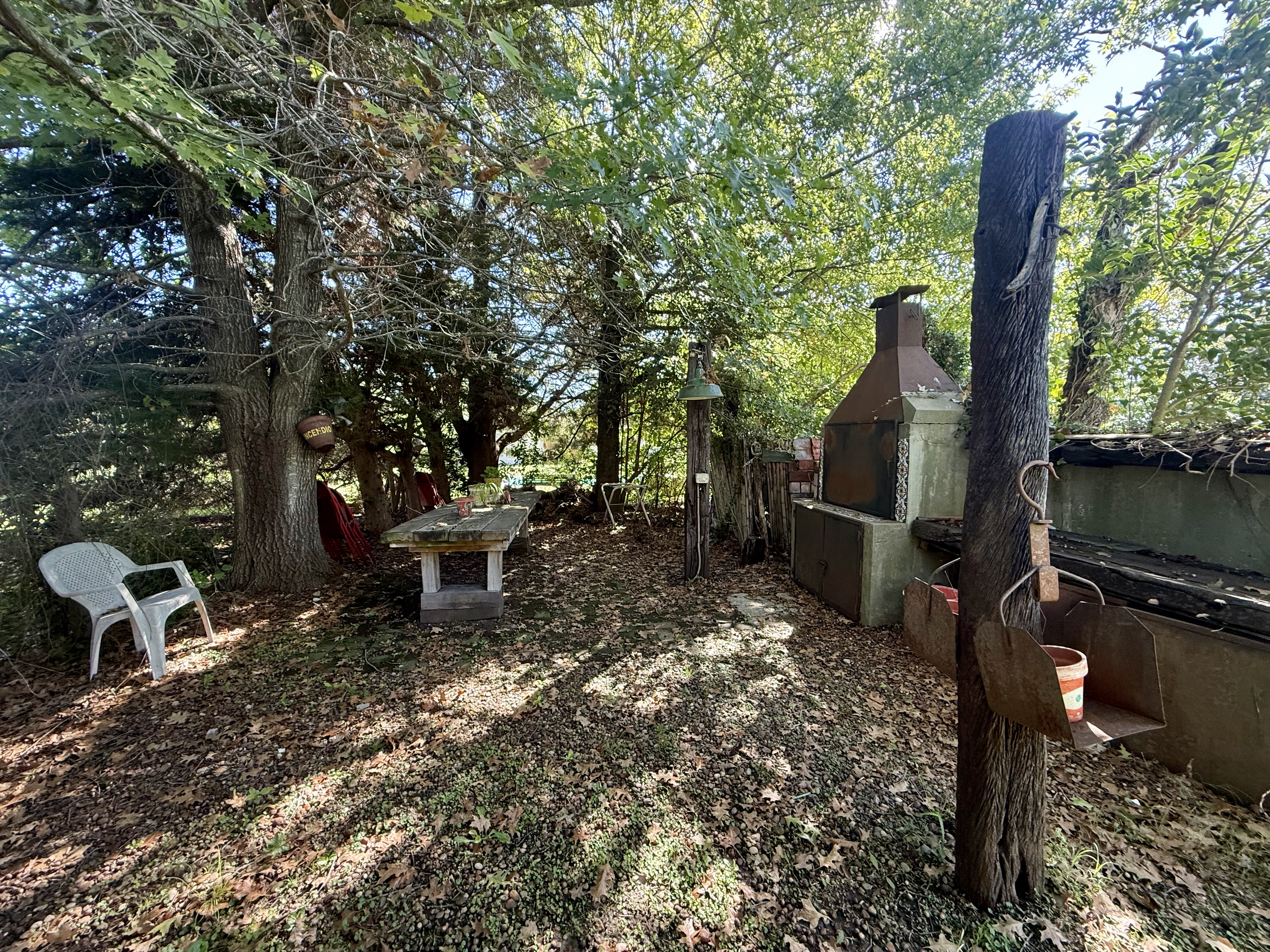 Parrilla al aire libre con mesada y piso de ladrillos, rodeada de arboles, sombra en verano y sol en invierno.